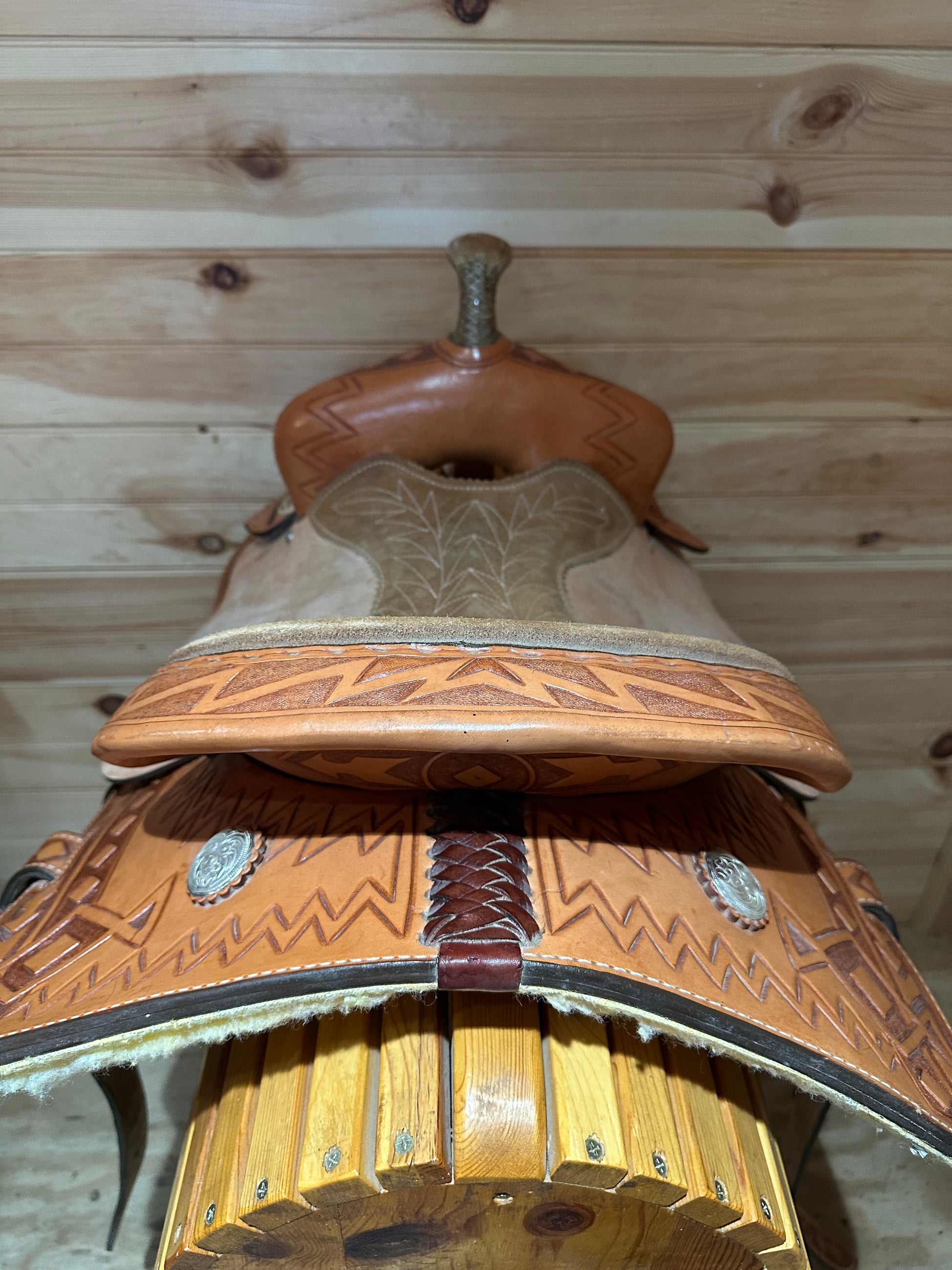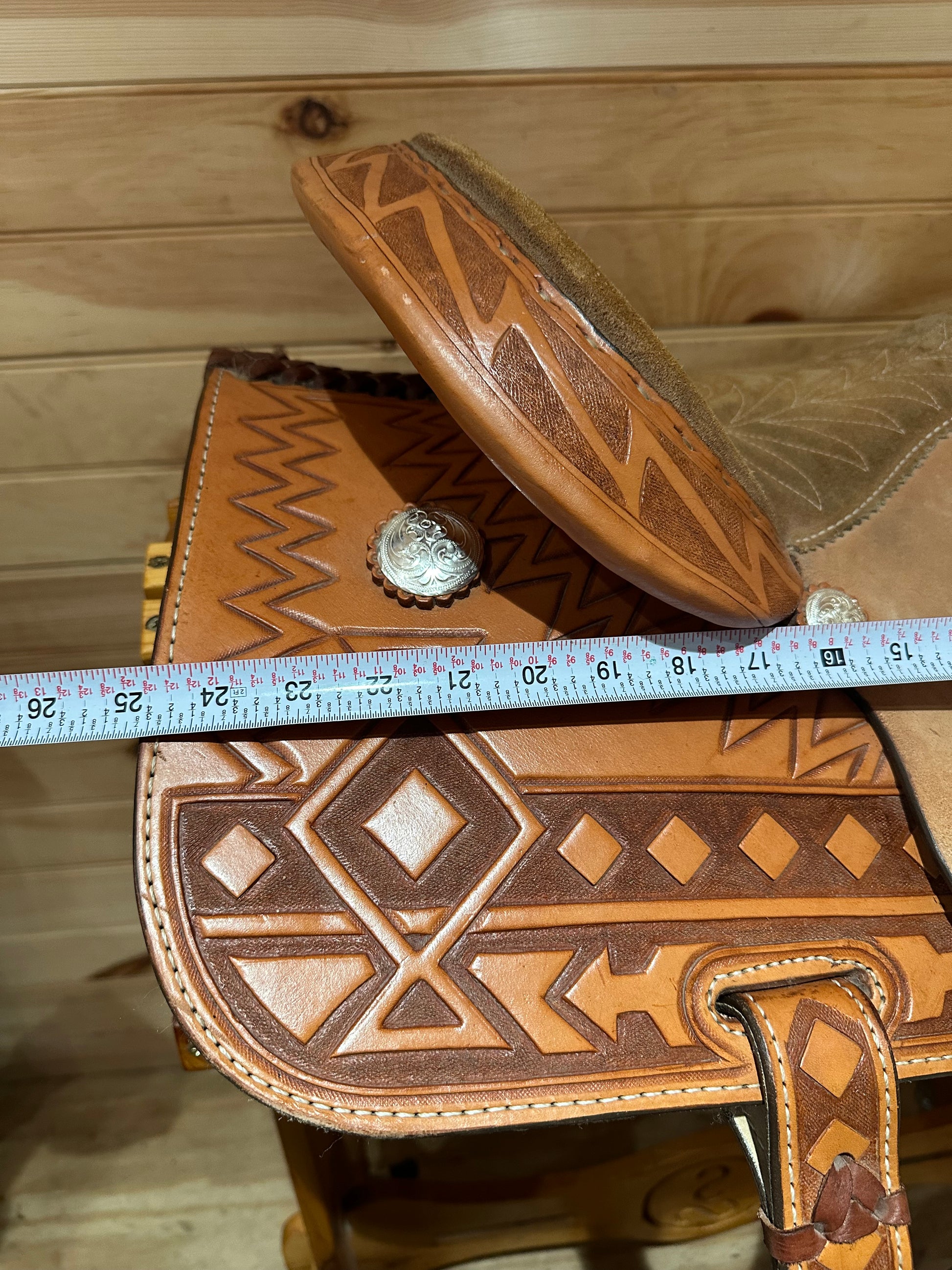 Features: Stand out with this Stunning and unique tribal tooling design, light oil leather with rough out jockey and fenders to help you stick the barrels. Rawhide laces horn and stirrups, silver conchos.