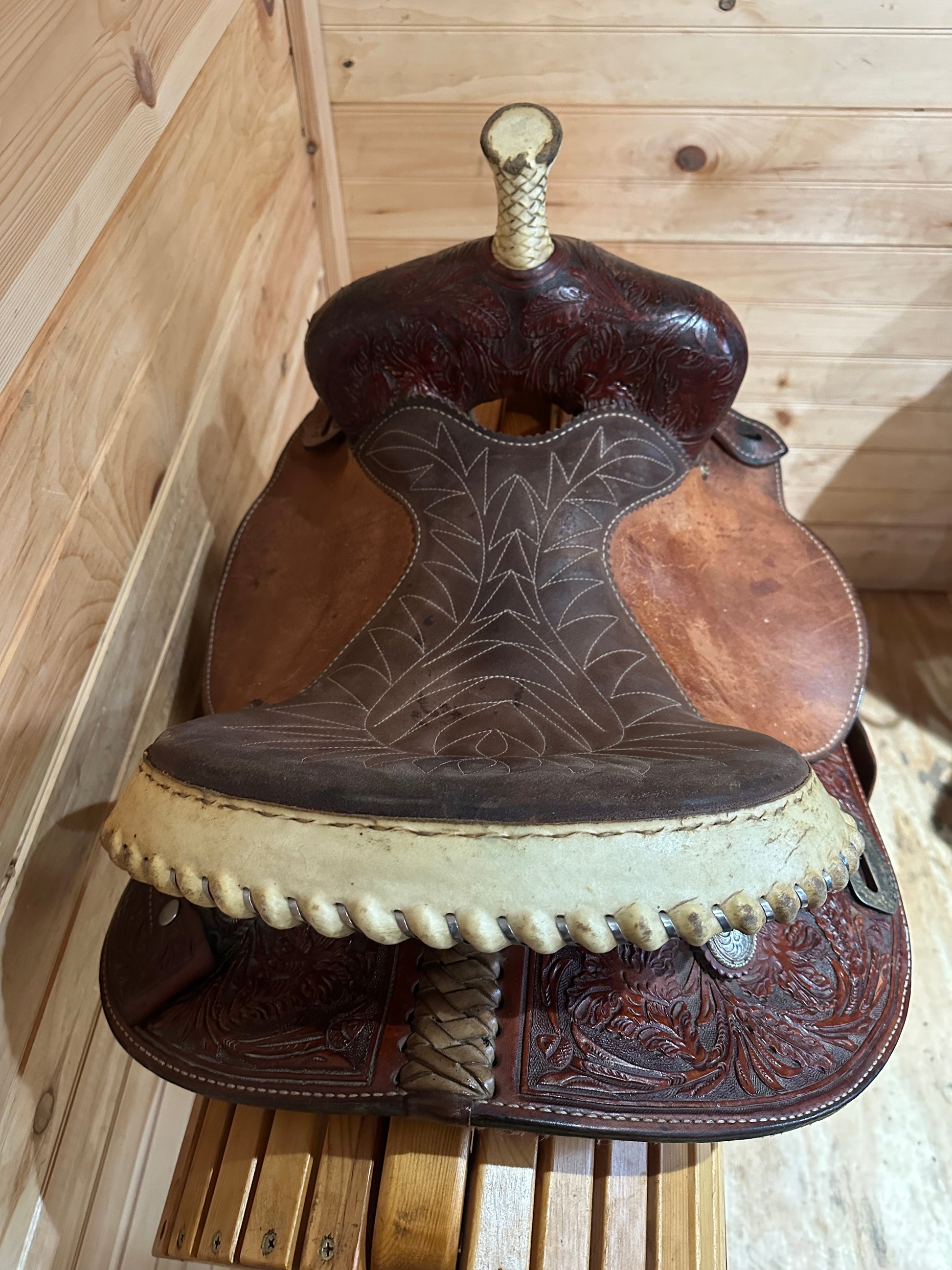 Features: deep seat, short compact skirt, rawhide accents, rough out jockey and fender, stitched brown suede seat