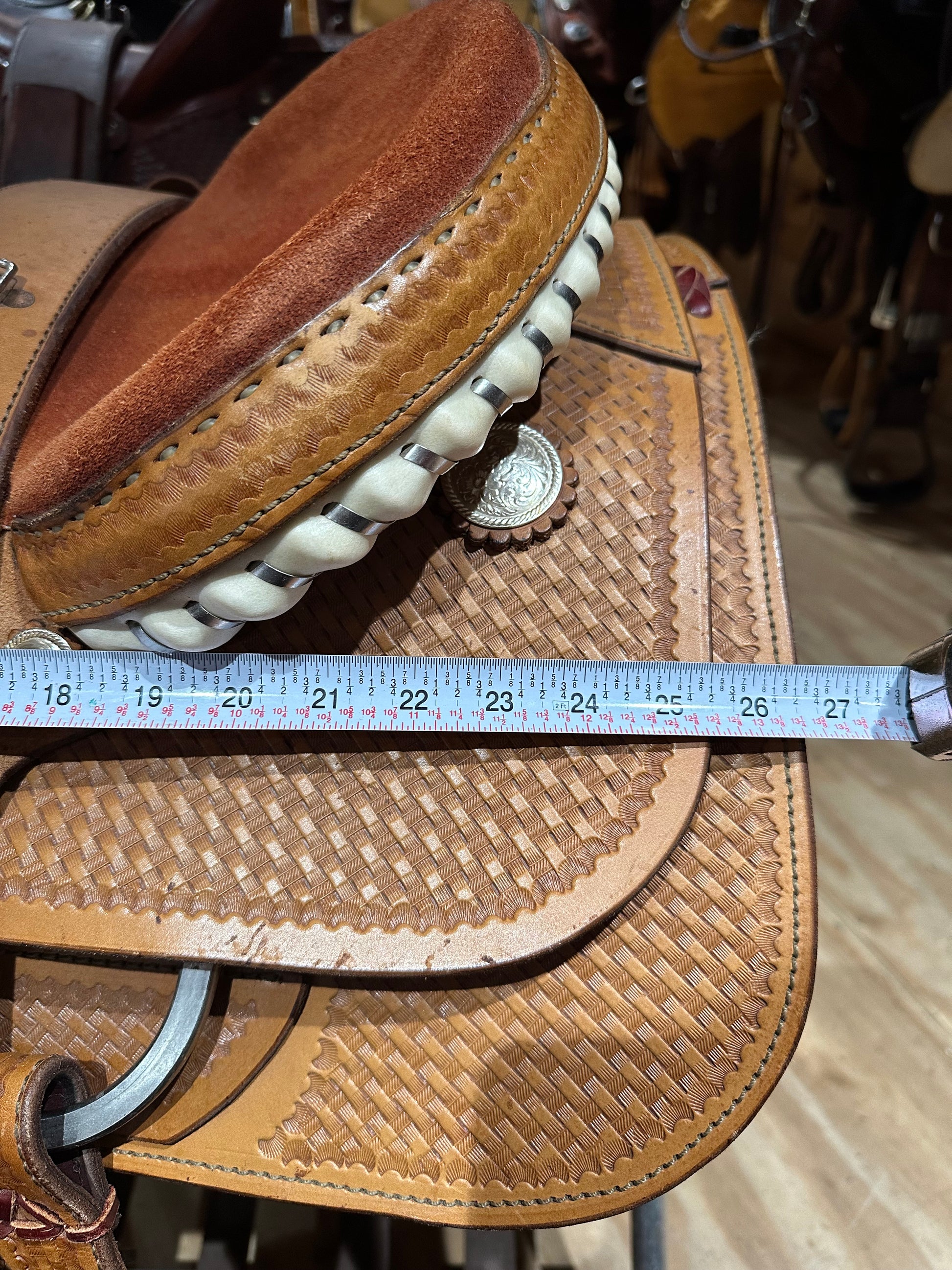 Features: classic basketweave tooled leather, rawhide laced cantle and stirrups, suede seat, silver conchos. Rigging and fender leathers are in excellent condition.