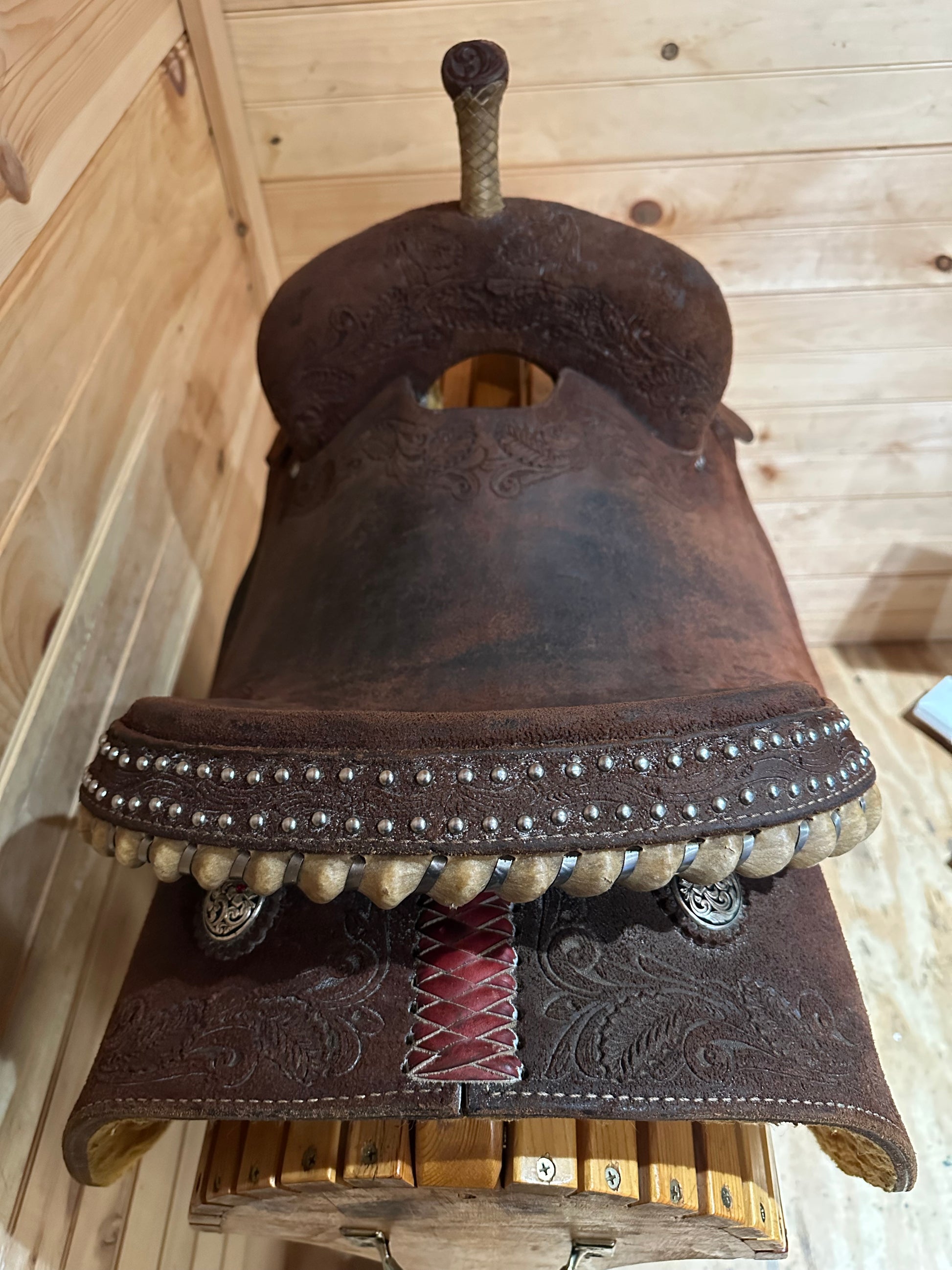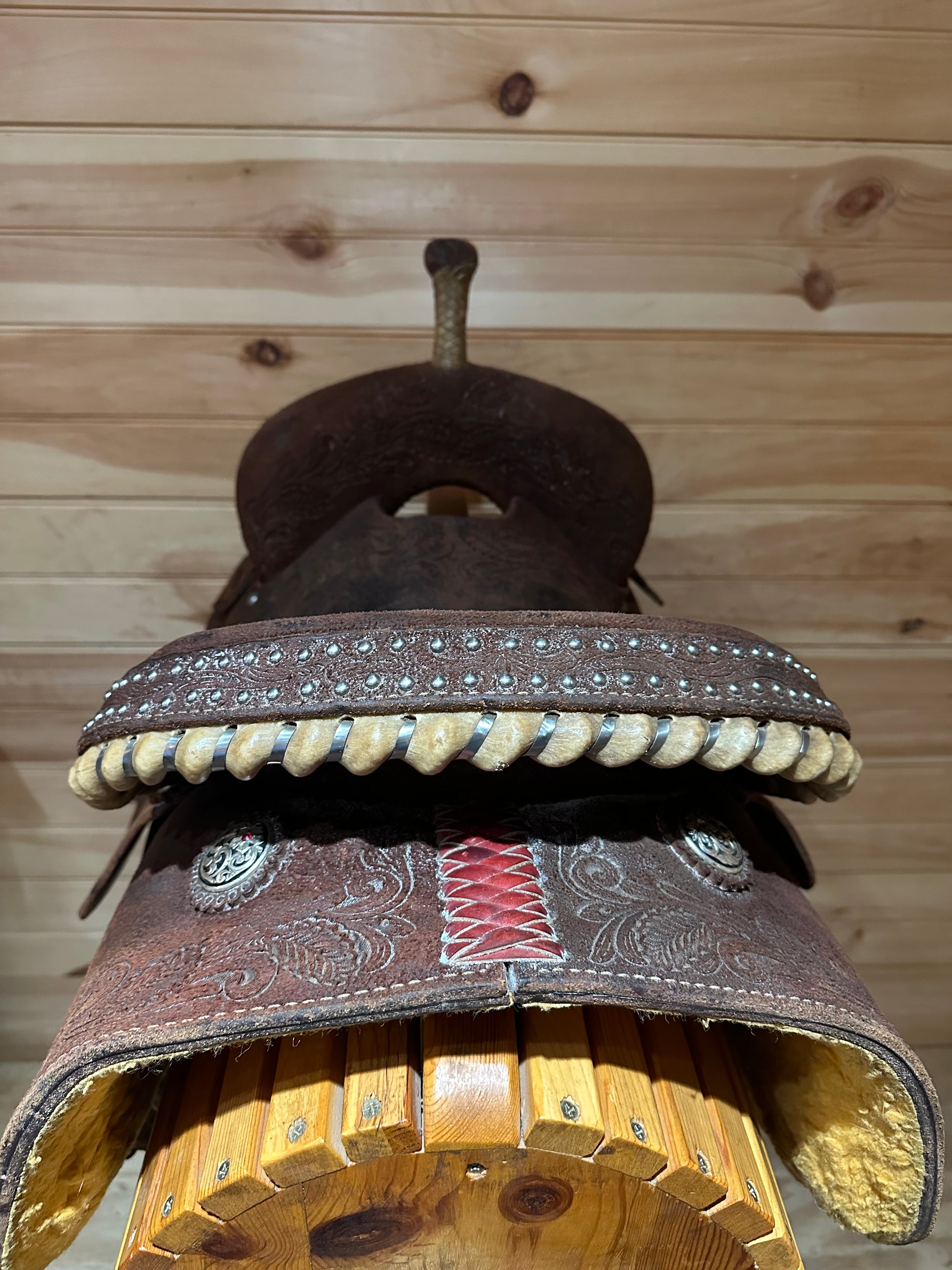 Features: Beautiful dark oil full rough out, tooled border, rawhide laced cantle and horn, square skirt, Silver dots line the cantle, Very deep seat, pliable leather, wood stirrups