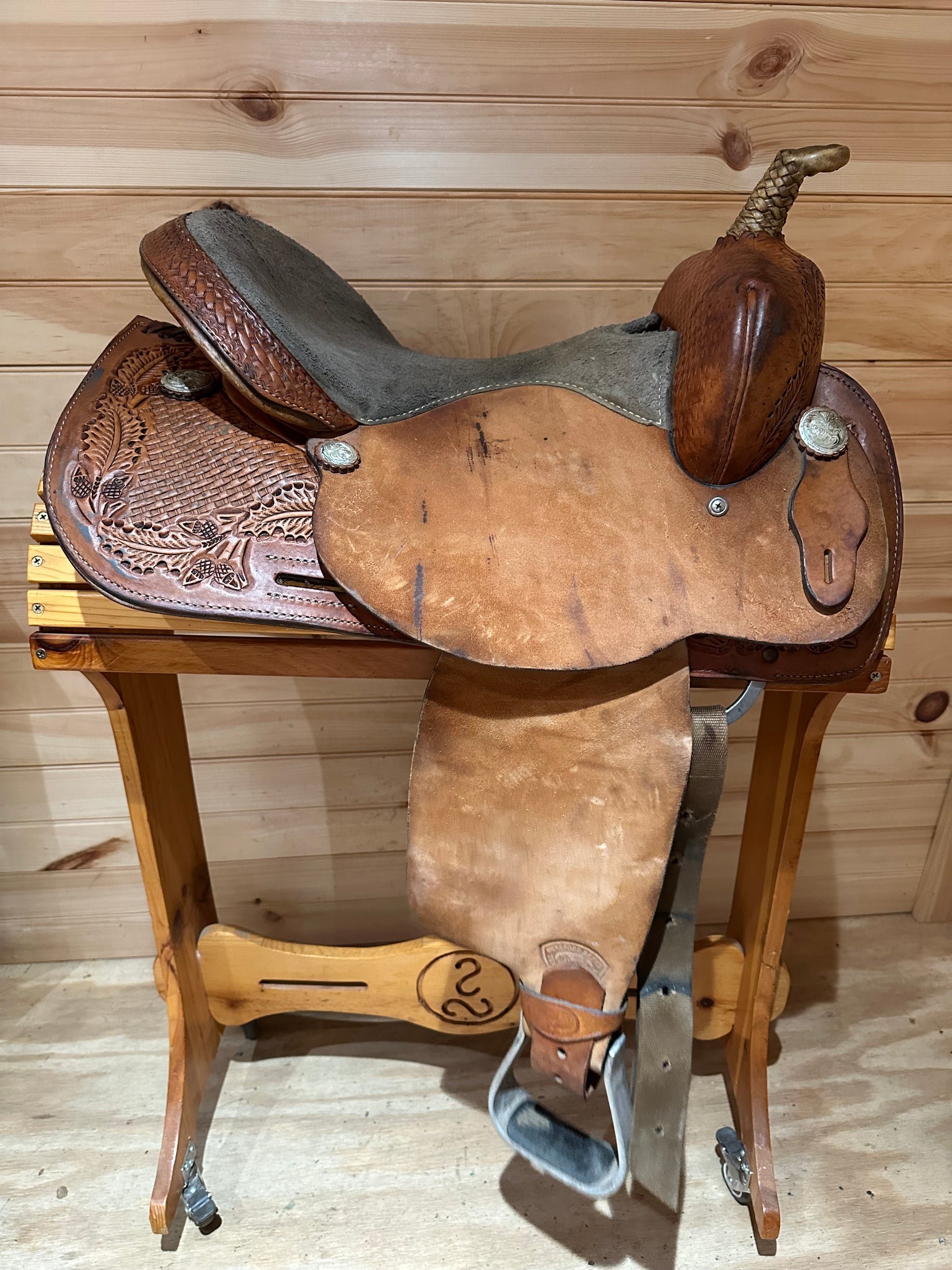 Features: Basketweave and oak leaf tooled skirt, rough out jockey and fenders, gray suede seat, rawhide wrapped horn and cantle, lightweight