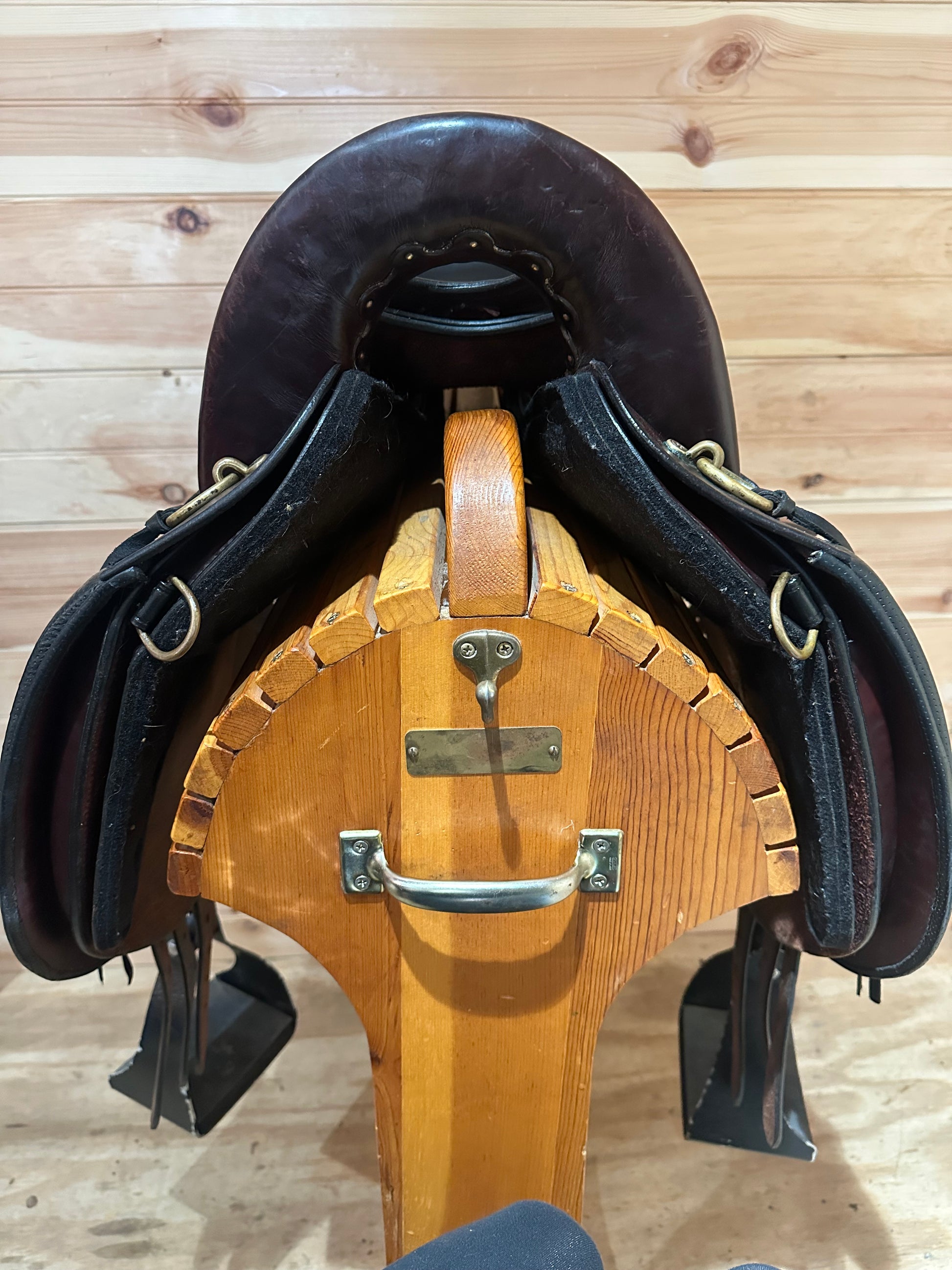Features: Beautiful dark brown leather with a black well padded seat and black knee pads, short skirt is ideal for short backed horses, generous gullet height for higher withers, saddle strings, English style rigging, endurance trail stirrups