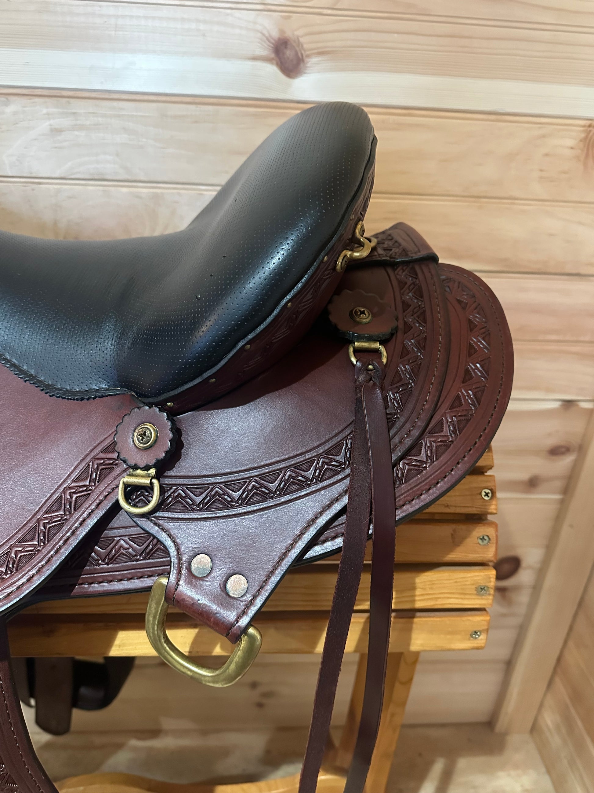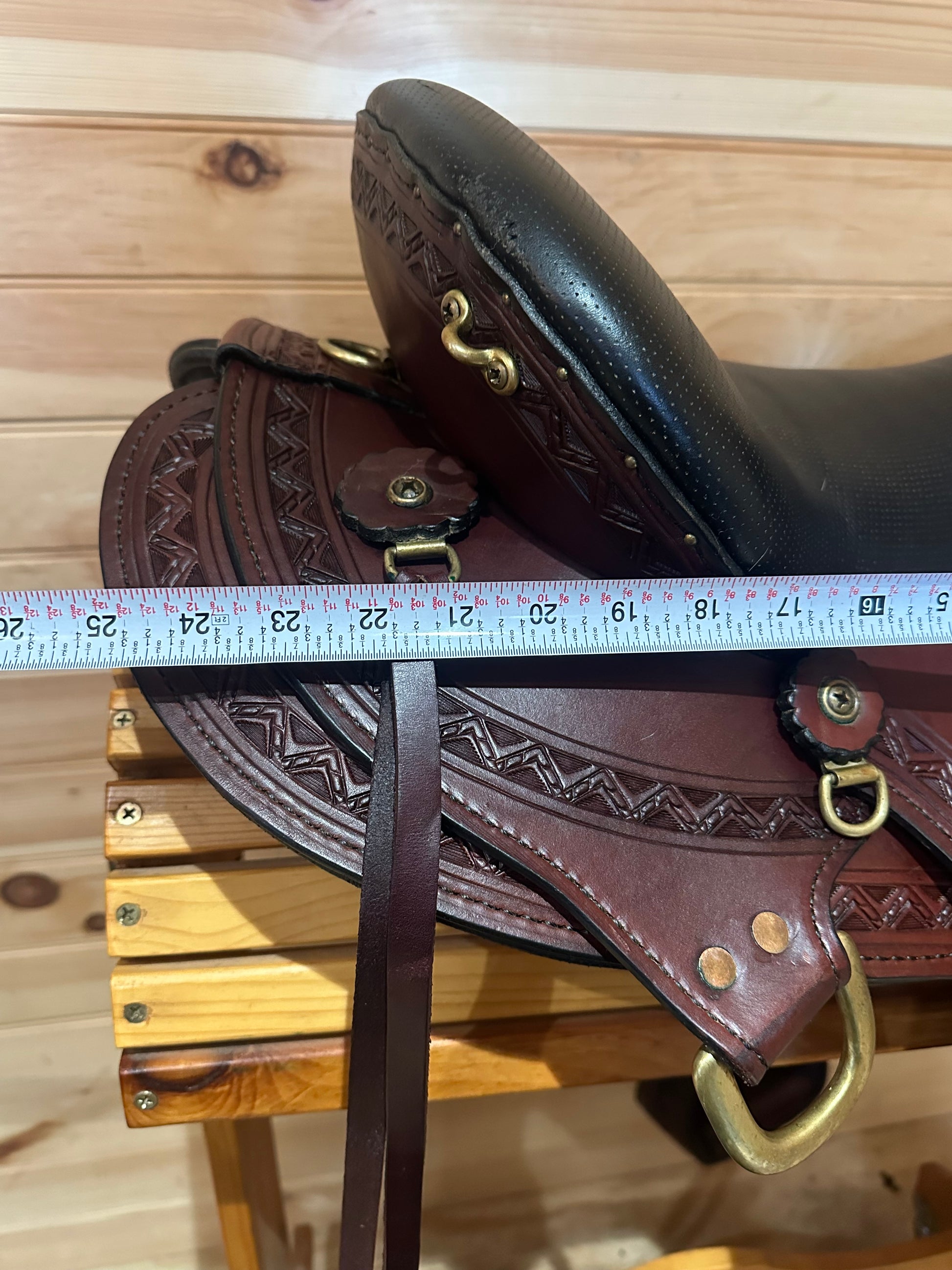 Trim: Smooth leather all over. Border Tool. Saddle strings attached. Rear dee for attaching back strap and crupper. Solid Brass Hardware.