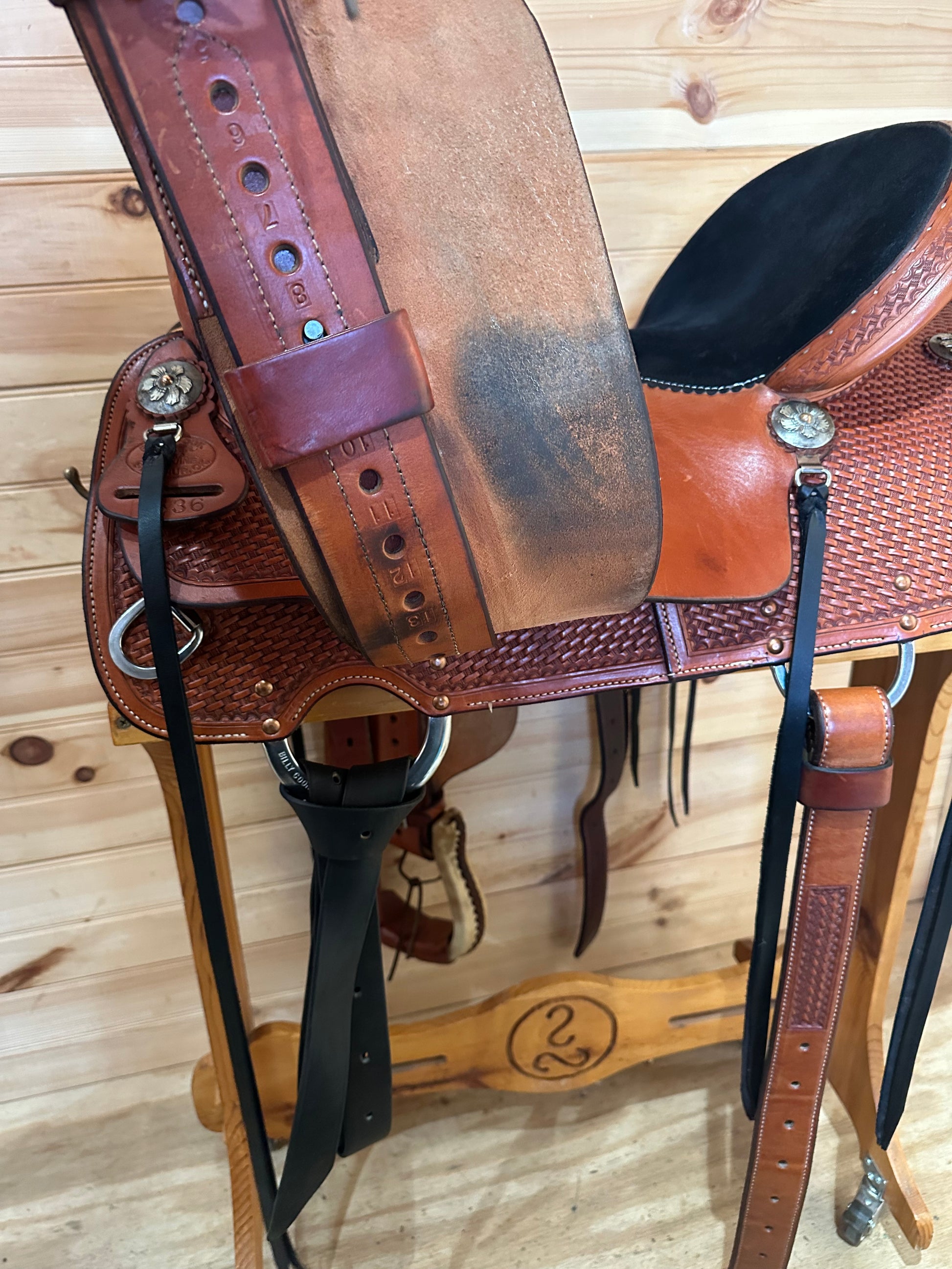 Features: Stunning Billy Cook made in 2024. Chestnut leather with basket weave tooling and black suede seat. Floral conchos.