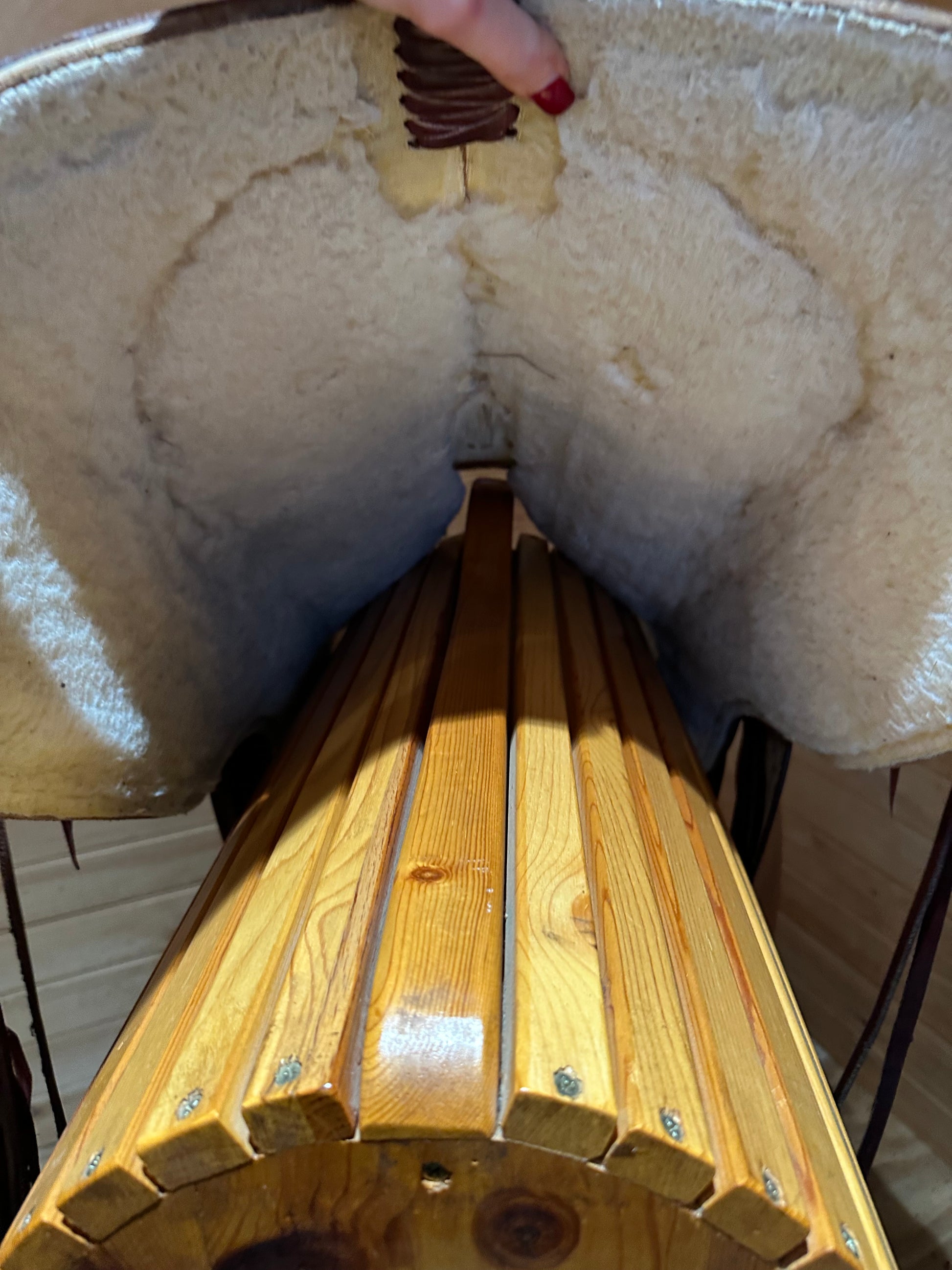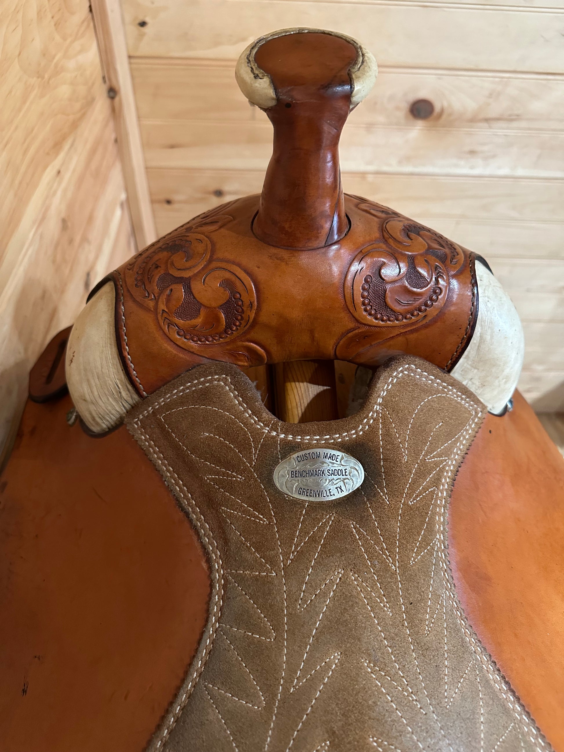 Features: Tooled leather skirts, Tan suede stitched seat, rawhide wrapped roper stirrups, pommel, and horn.