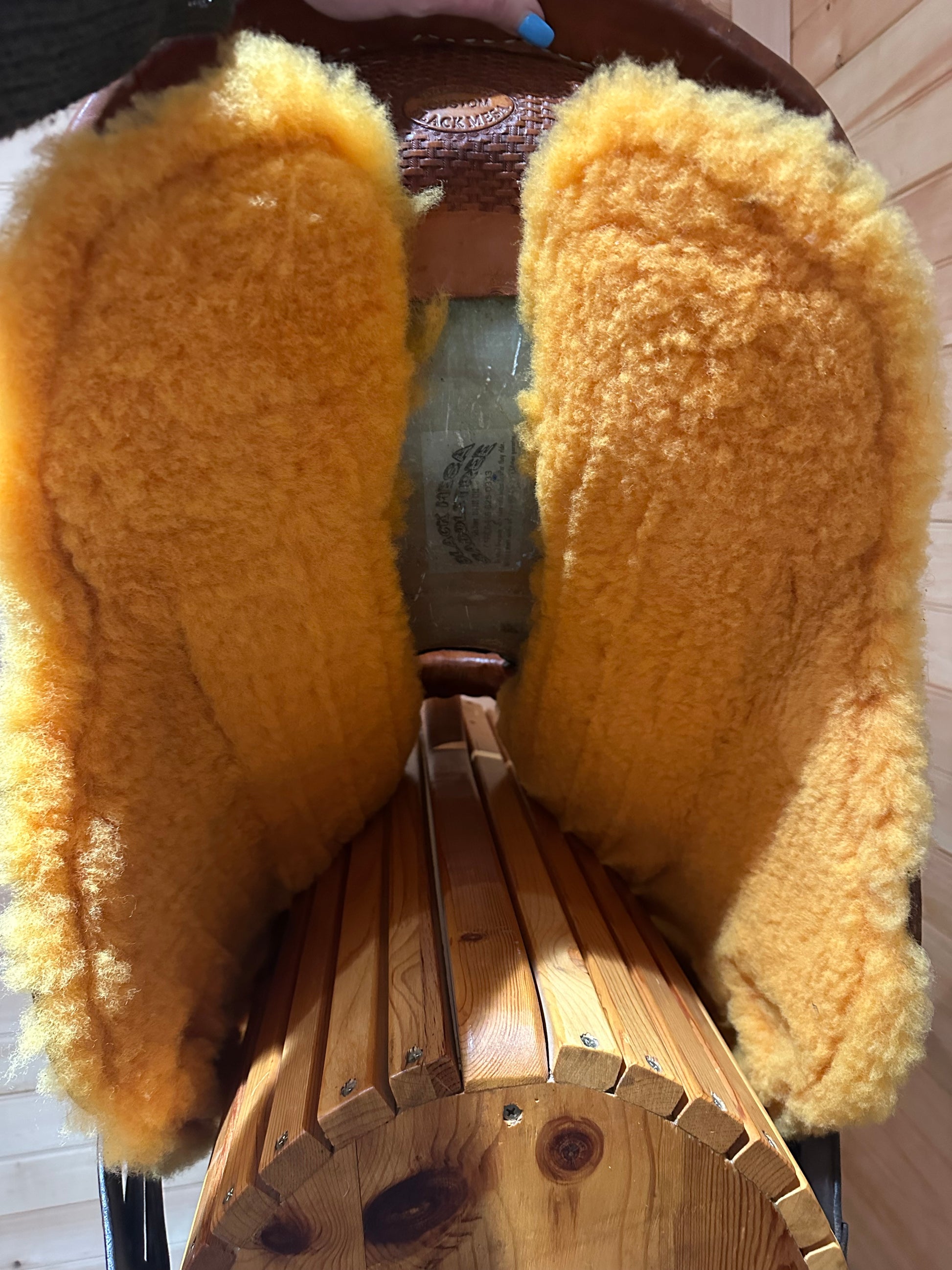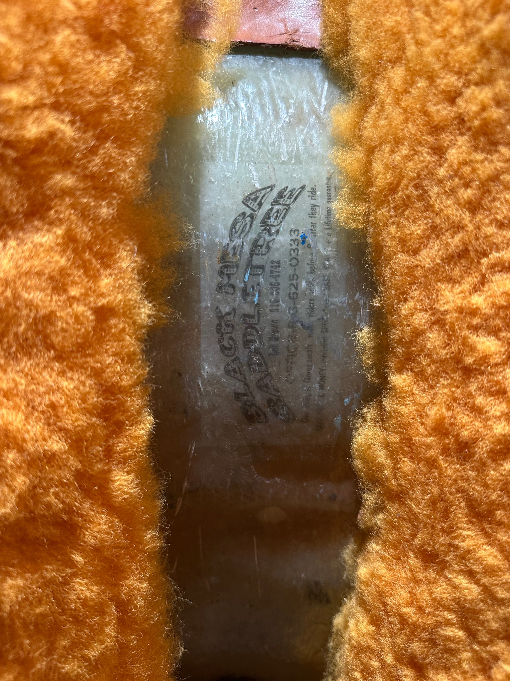 Features: Beautiful quality leather, tooled and two-tone leather accents, black suede seat, very deep and secure seat, three way in skirt rigging, fleece is like new