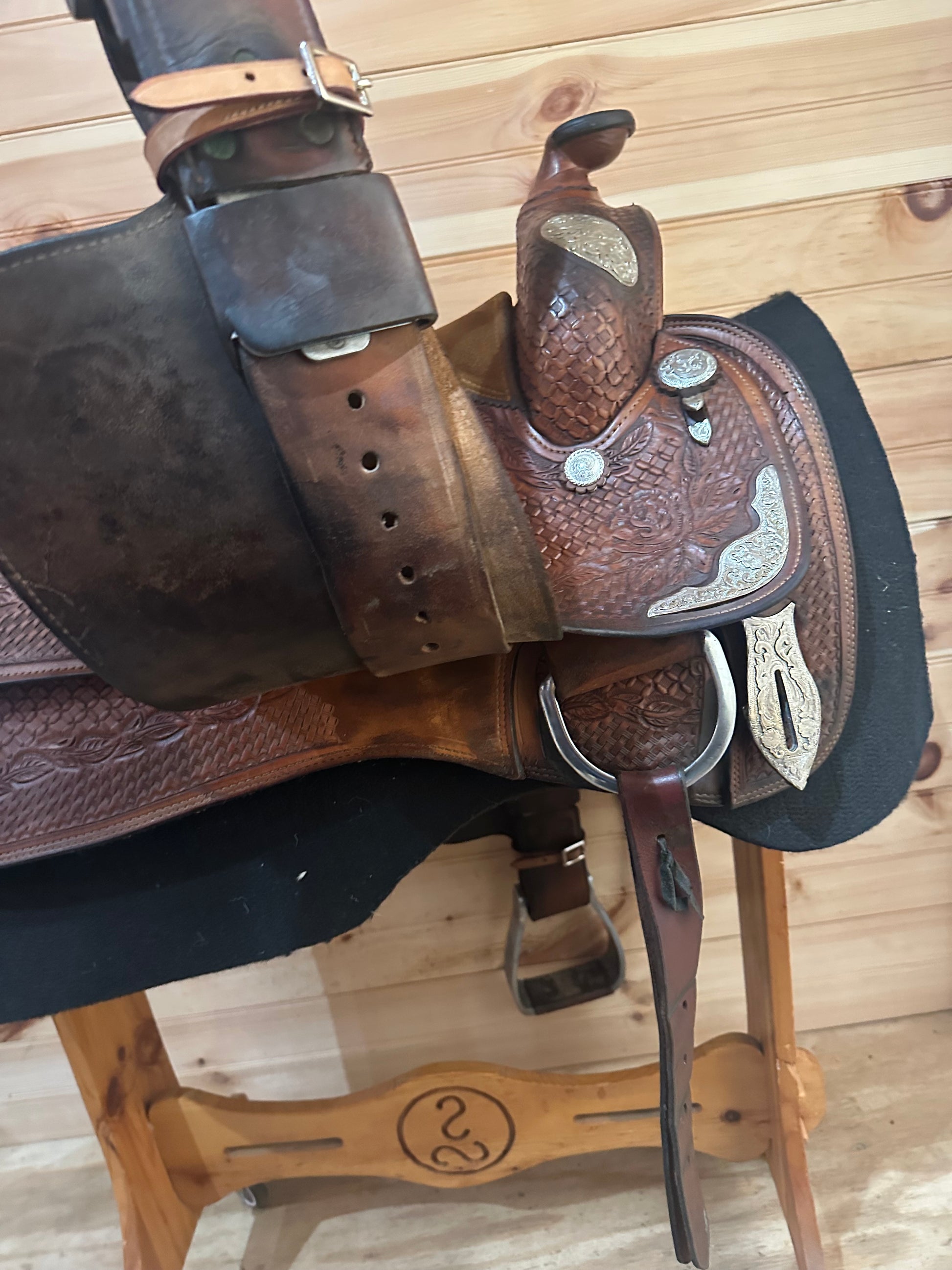 Features: Soft and Supple leather, sandstone suede padded seat, equitation style horn, combo tooled basket weave and floral leather, beautiful silver accents throughout, engraved stirrups. Close contact skirt. Full Quarter horse bar with shoulder relief flare.