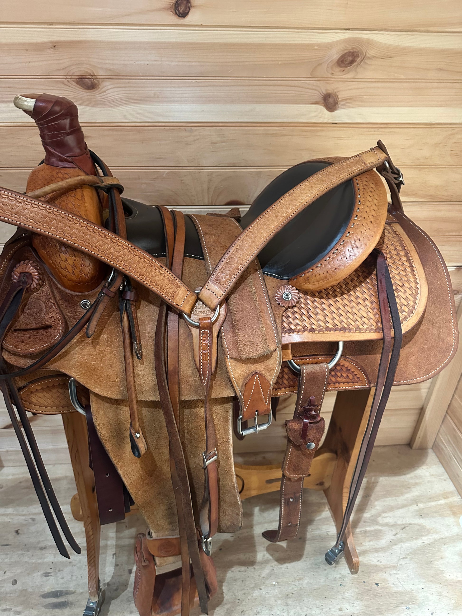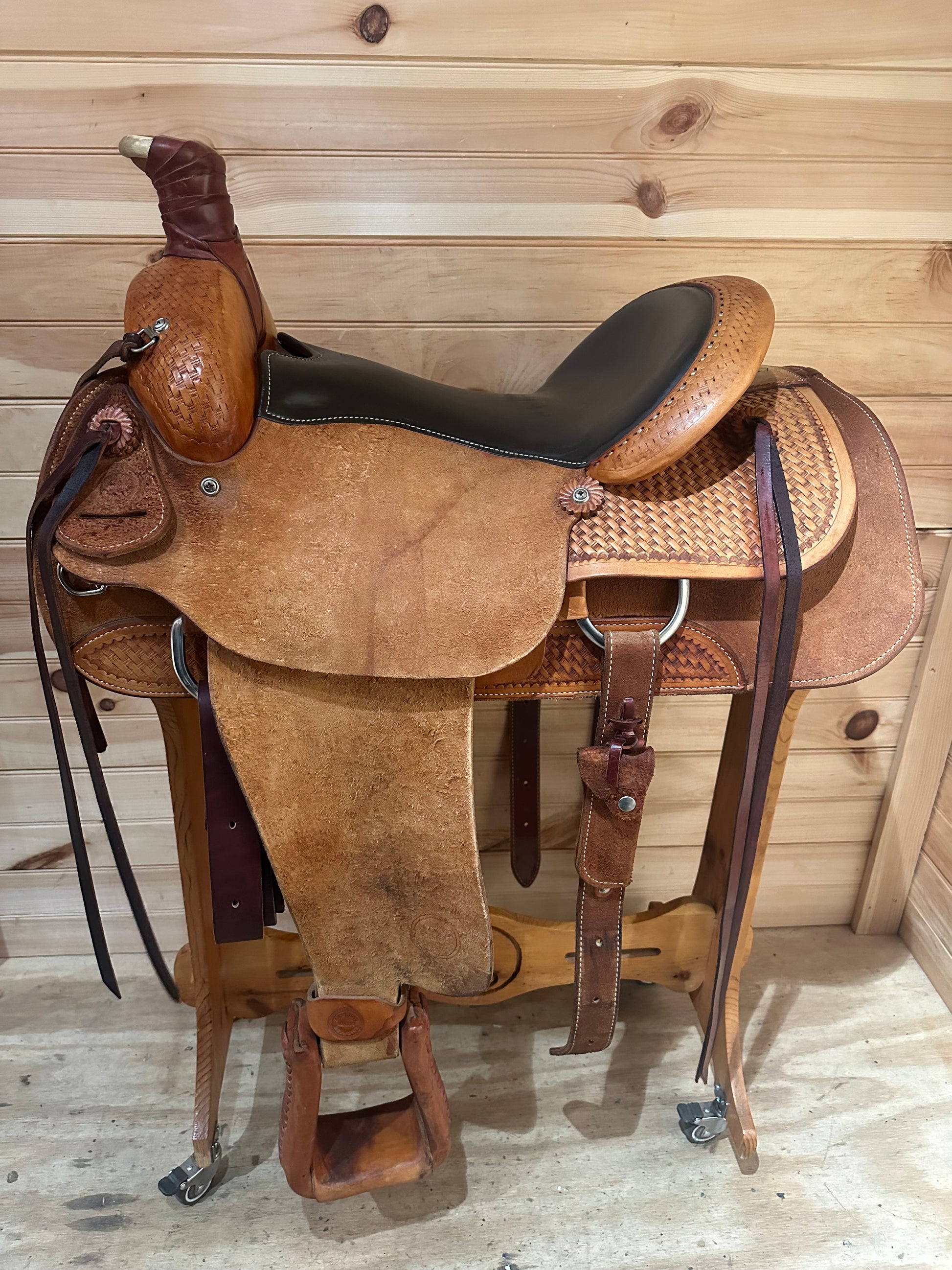 Features: Deep padded seat, roughout jockeys and fenders, wrapped horn, Cheyenne roll, roper tree, heavy duty quality leather