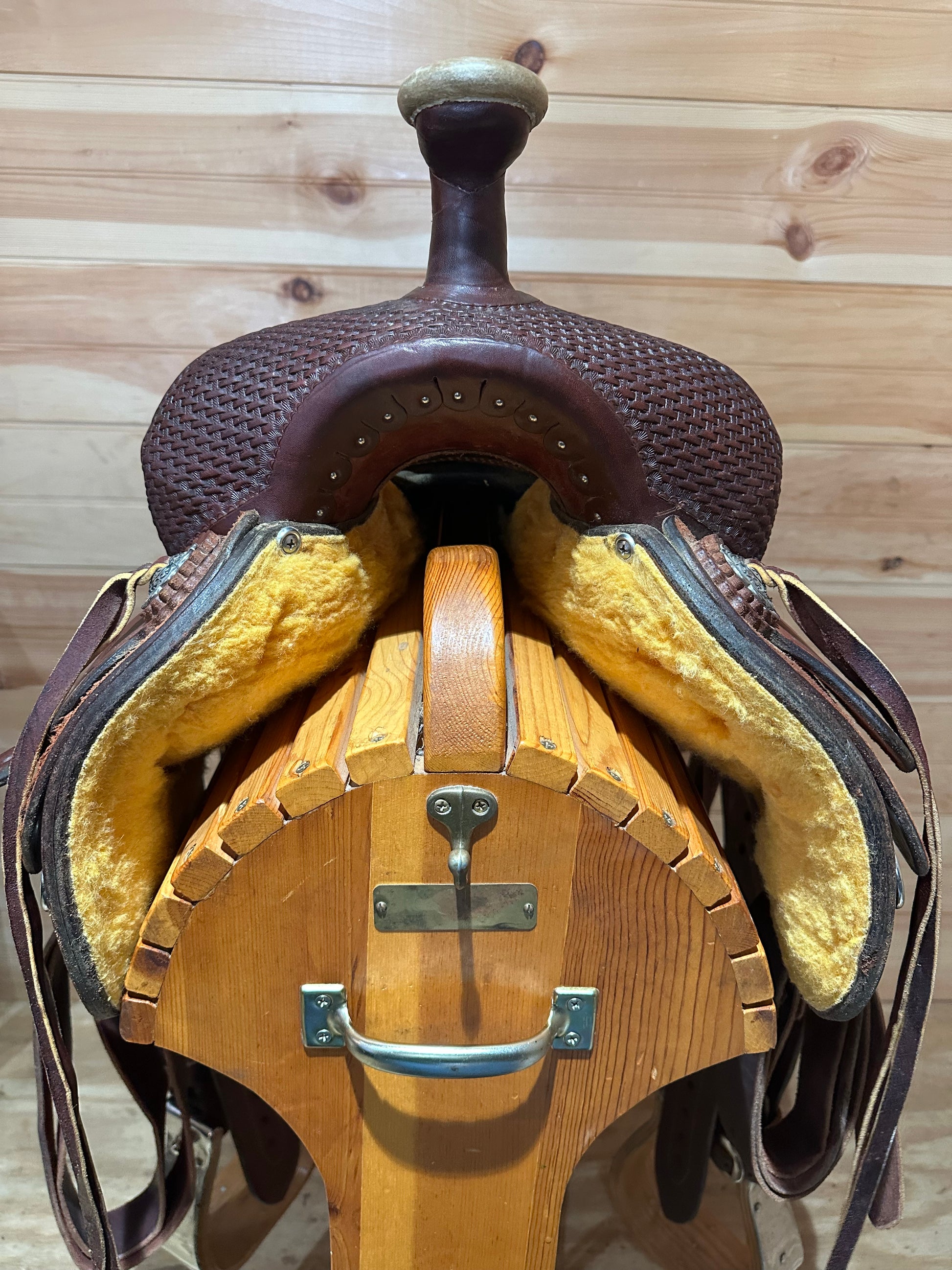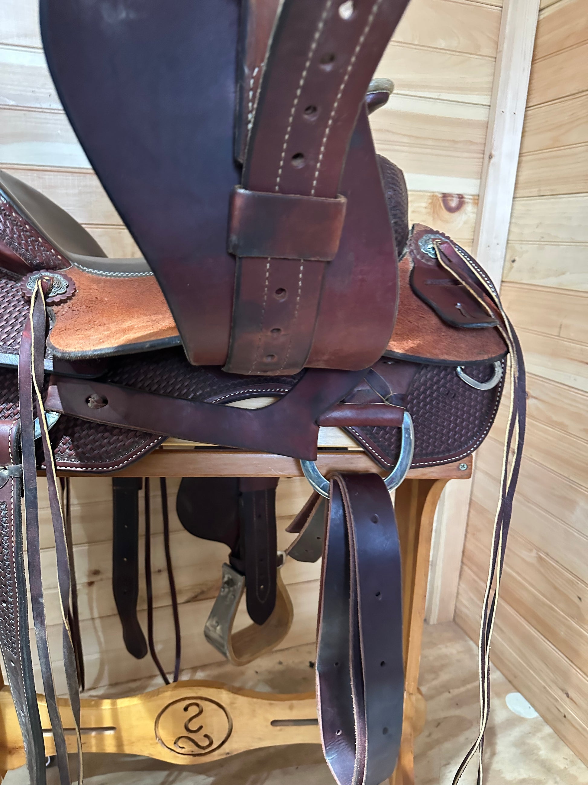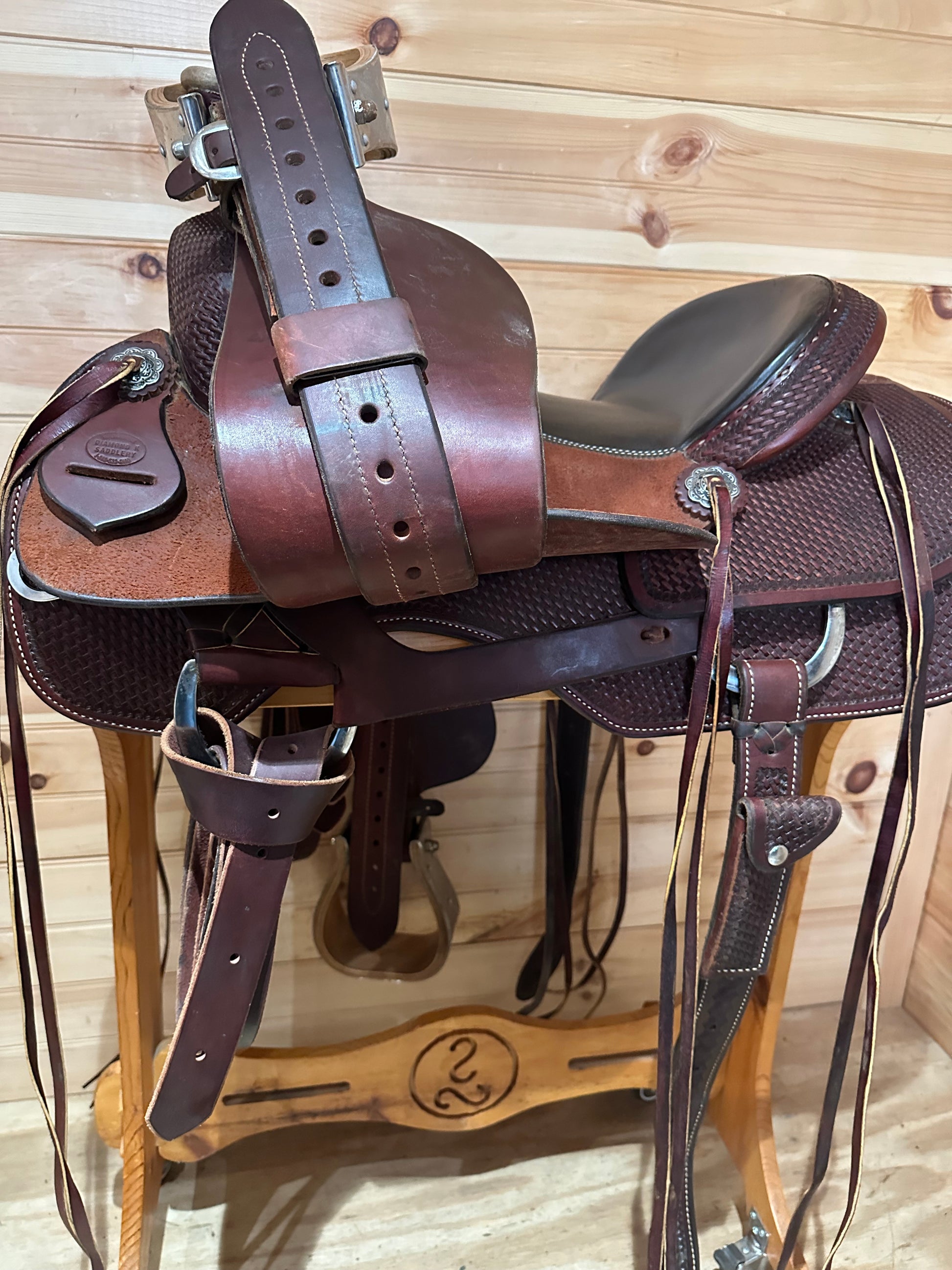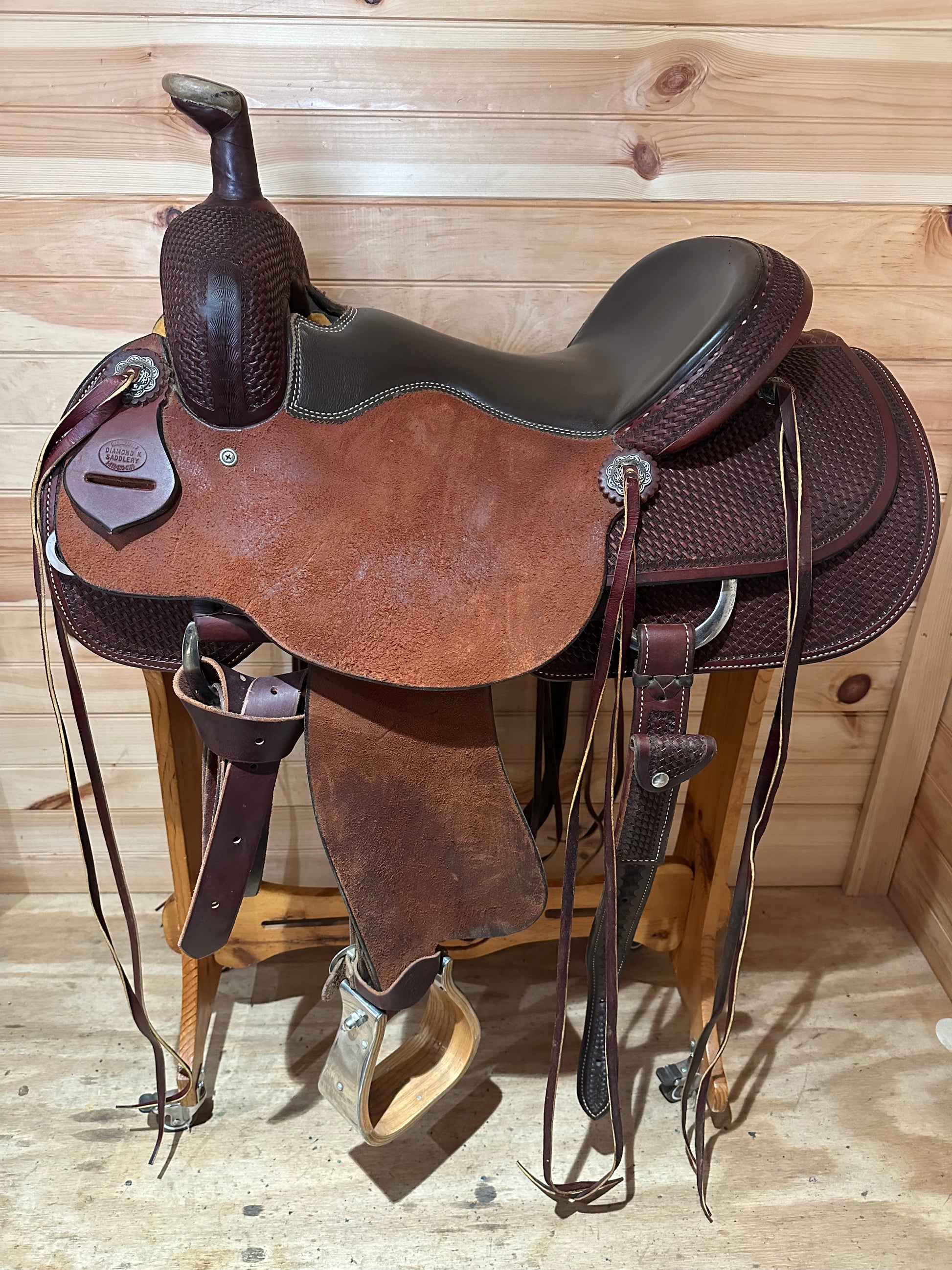 Features:Beautiful Association Ranch Roper made by Diamond K Saddlery. Dark oil basket weave tooled leather with rough out jockey and fenders, smooth grainout seat, Jeremiah Watt Conchos, wrapped wood ranch style stirrups