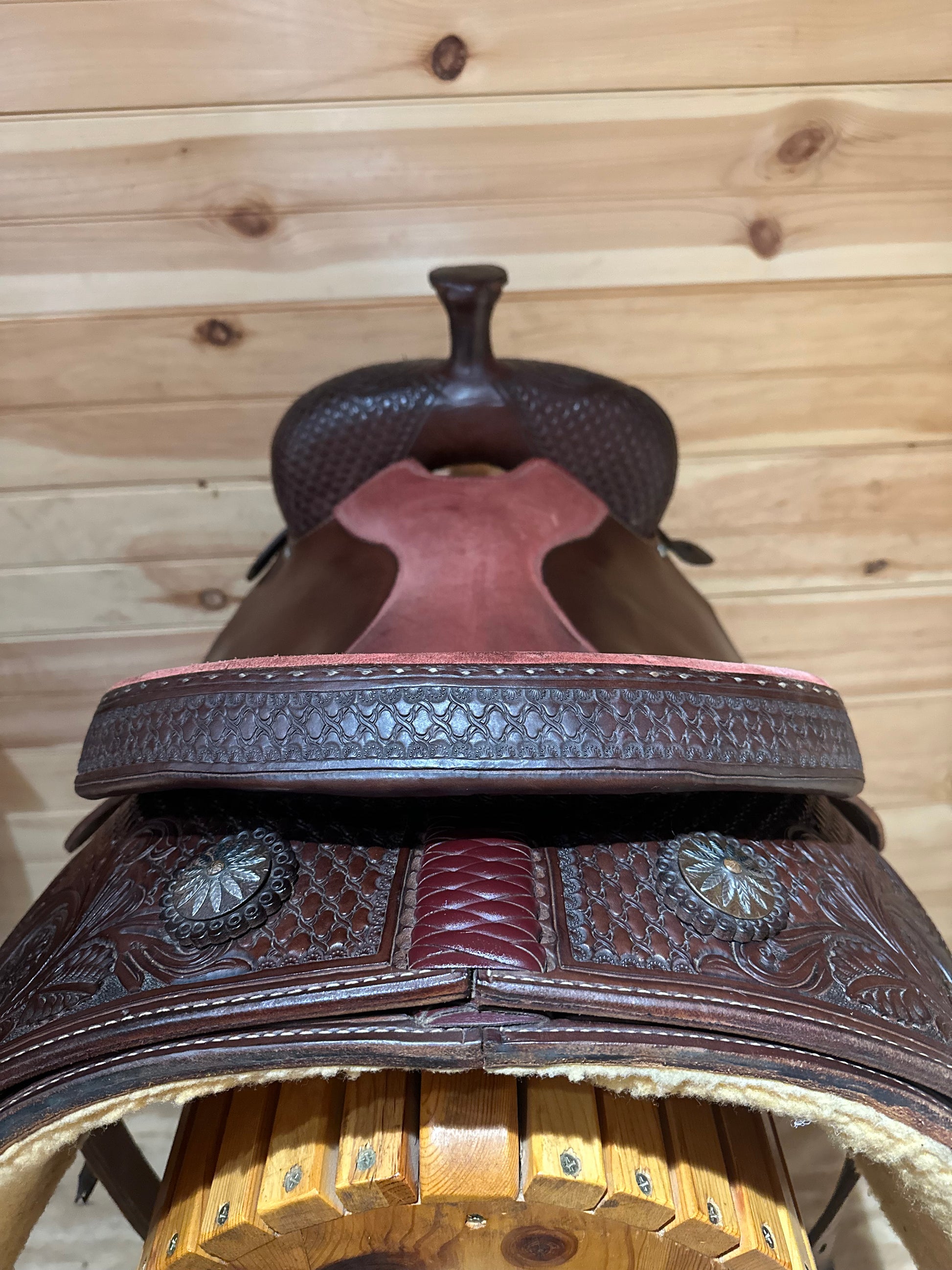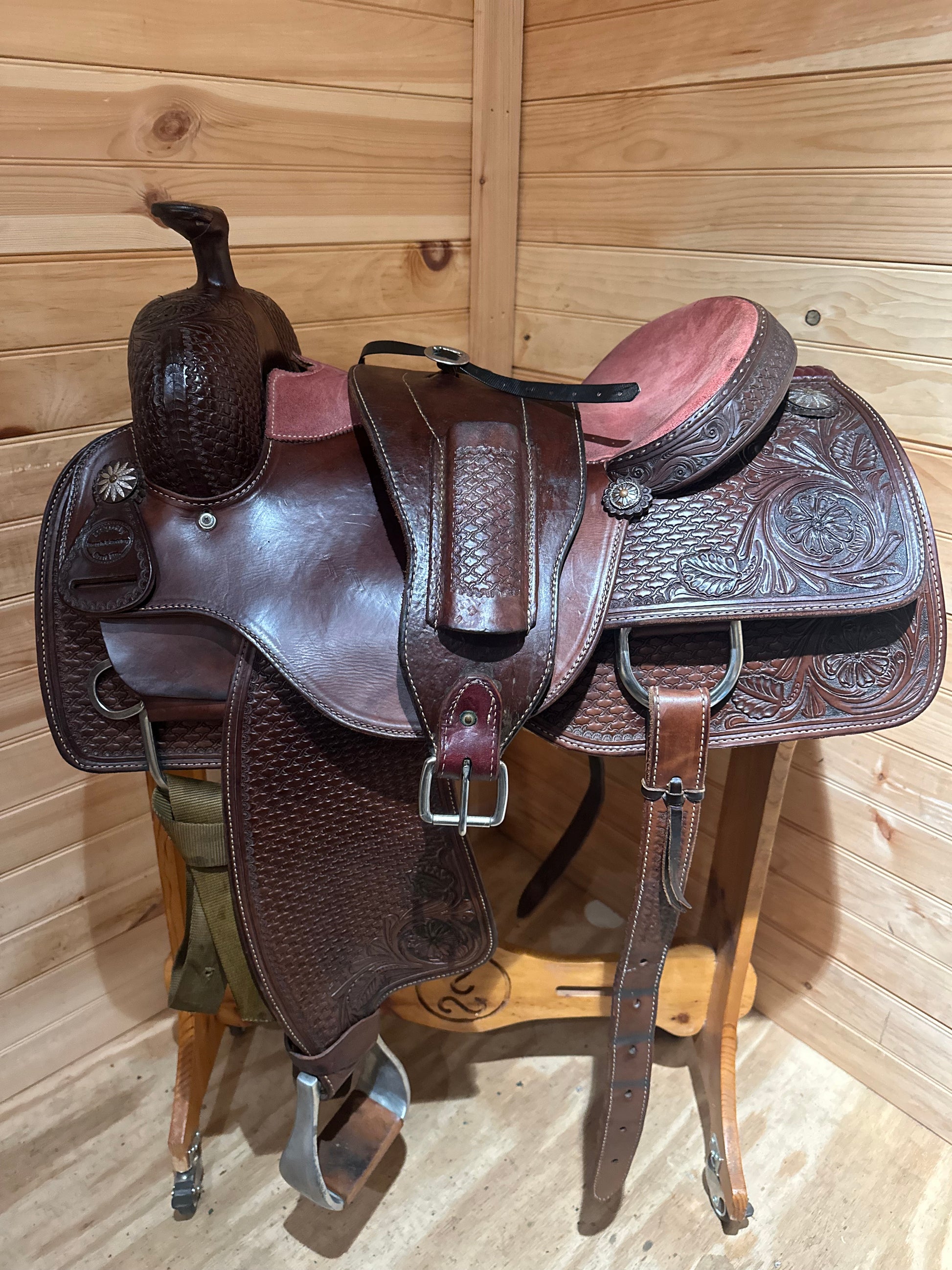 Features: Built tough for a purpose with a ladies touch. This stunning custom women’s roper by Draggin S Saddlery is very lightly used. Daisy conchos, Dual tooling on a dark oil leather. Rose colored suede seat, Aluminum stirrups. Genuine sheepskin lined skirt.