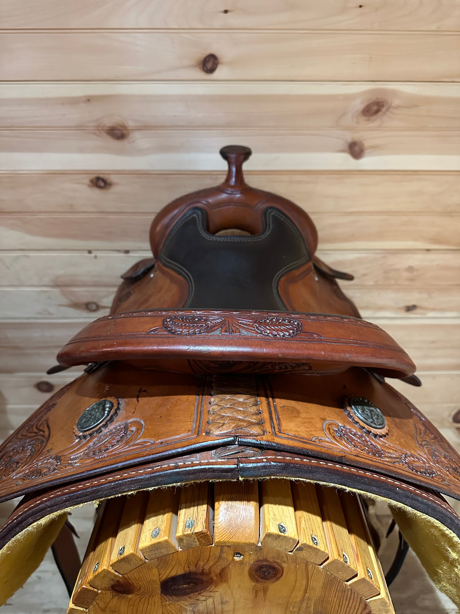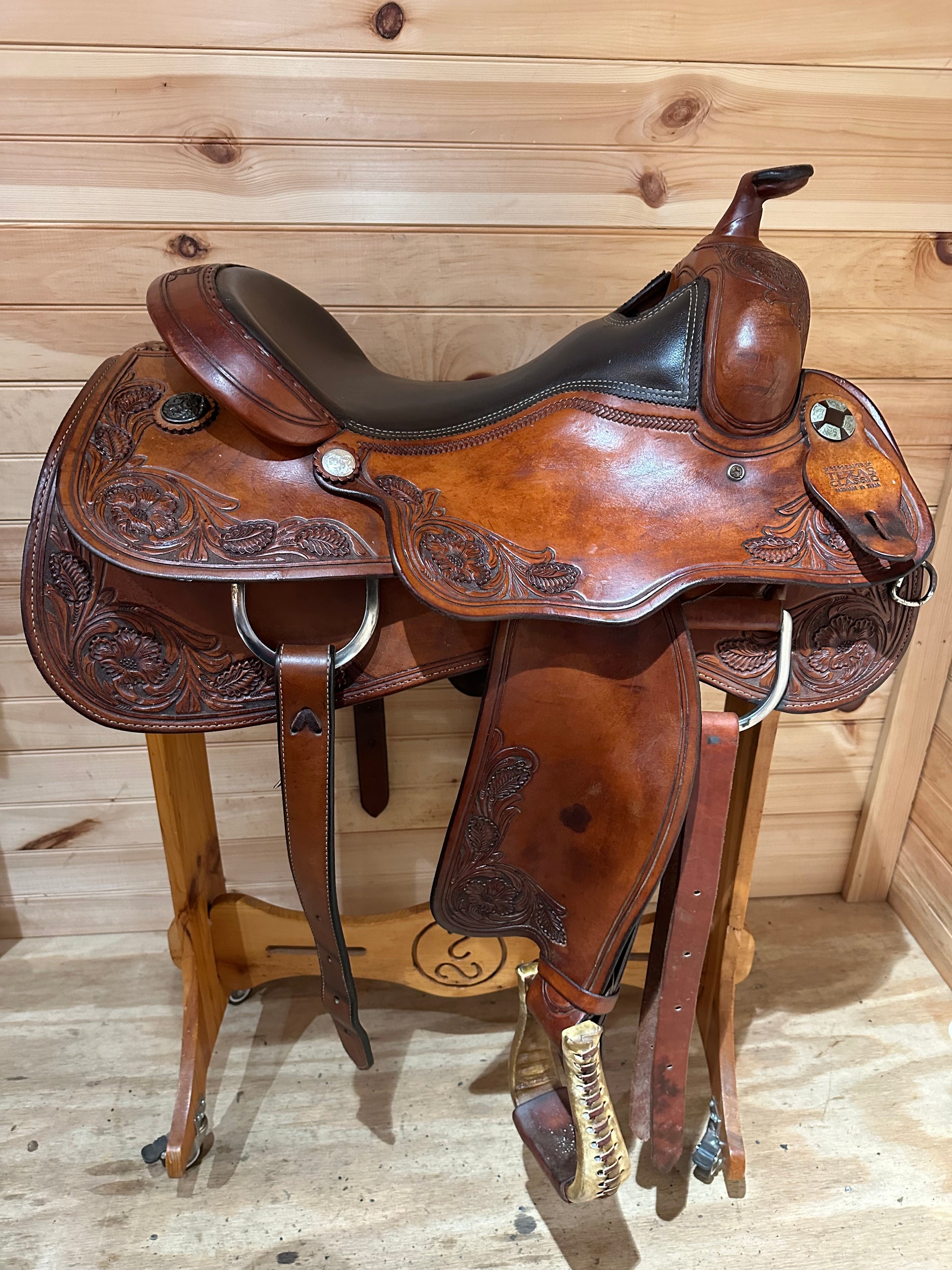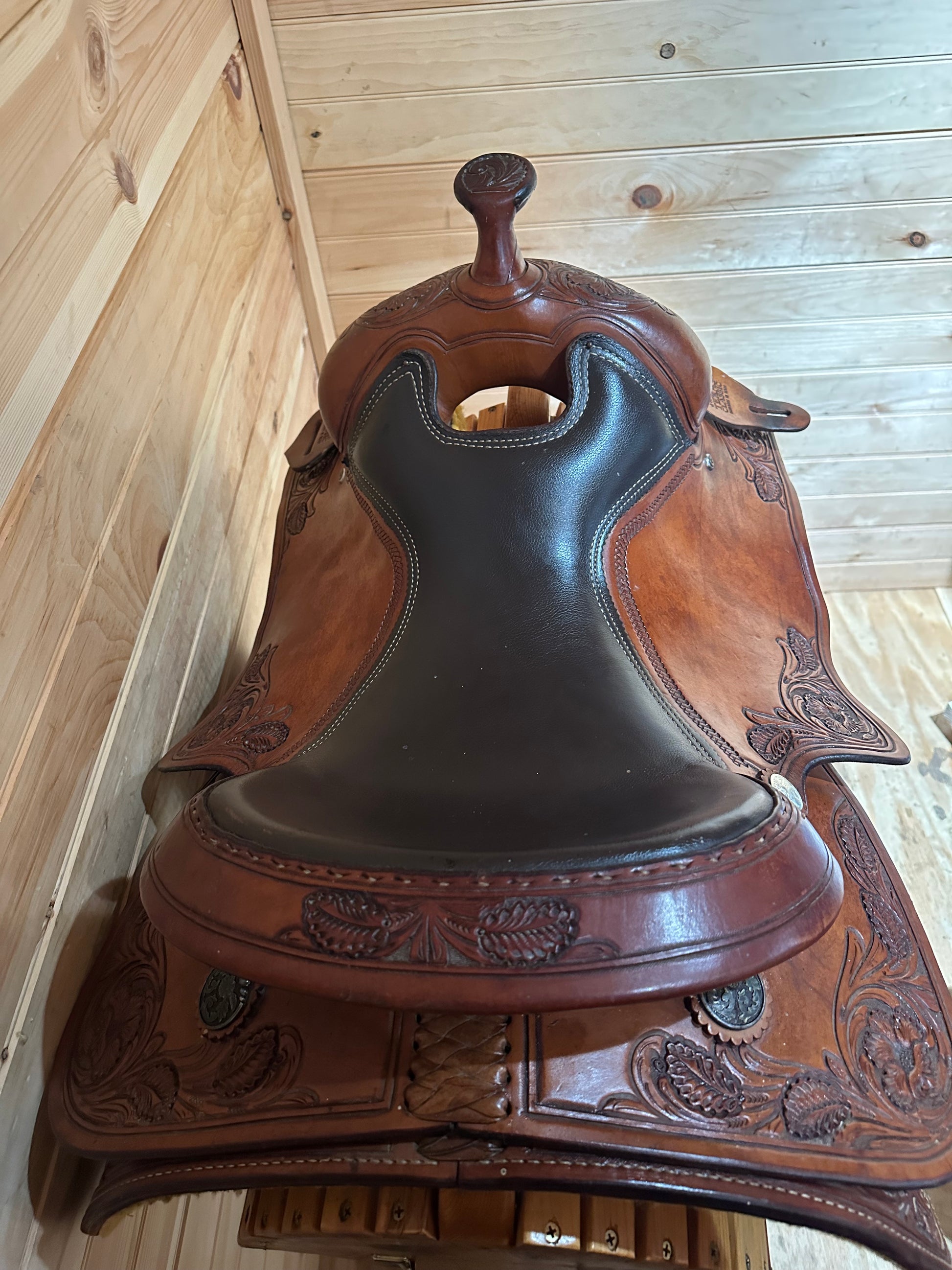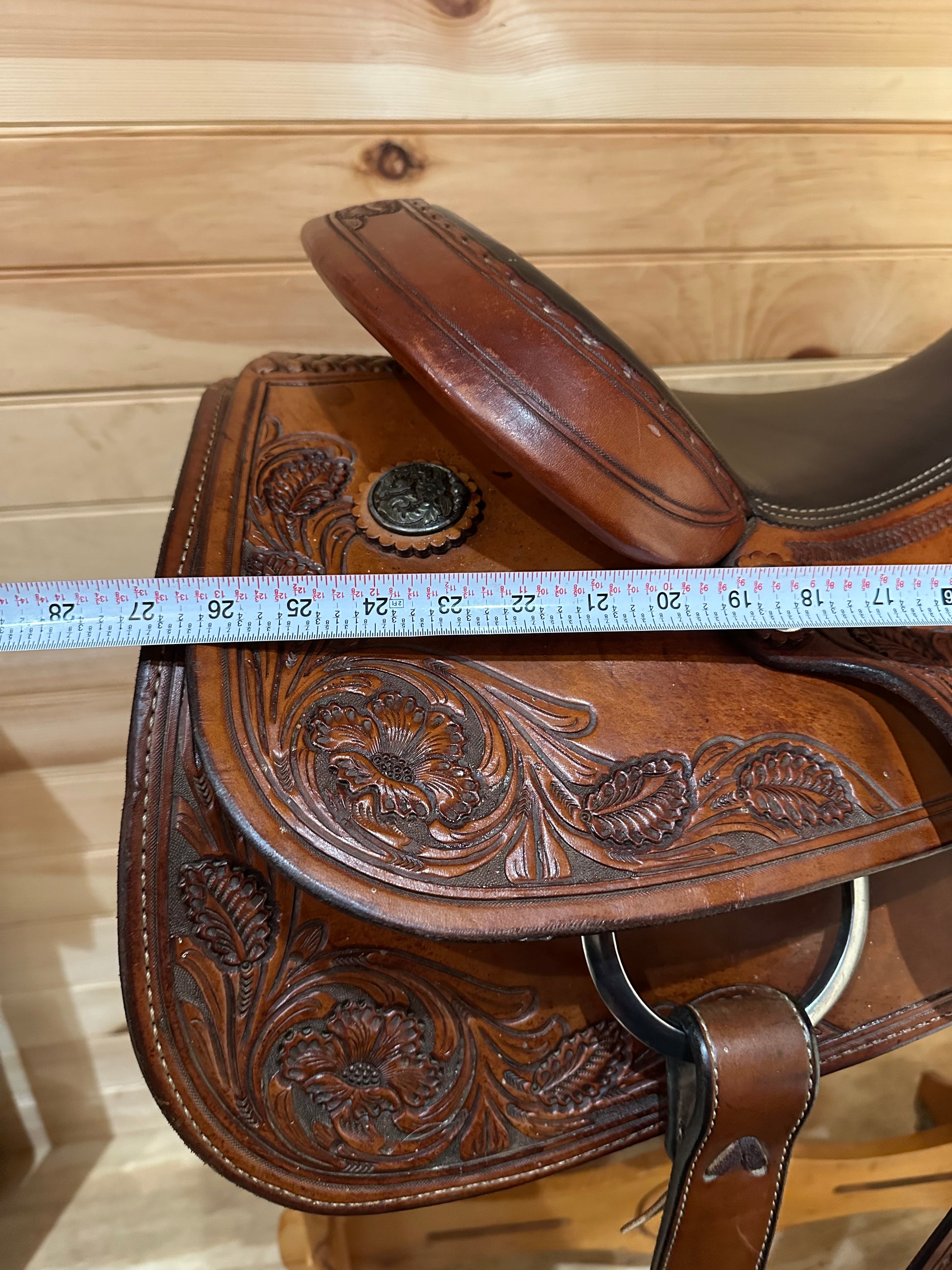 Features: Beautiful floral tooling, close contact butterfly skirt, chocolate grain out seat, pre-turned stirrups