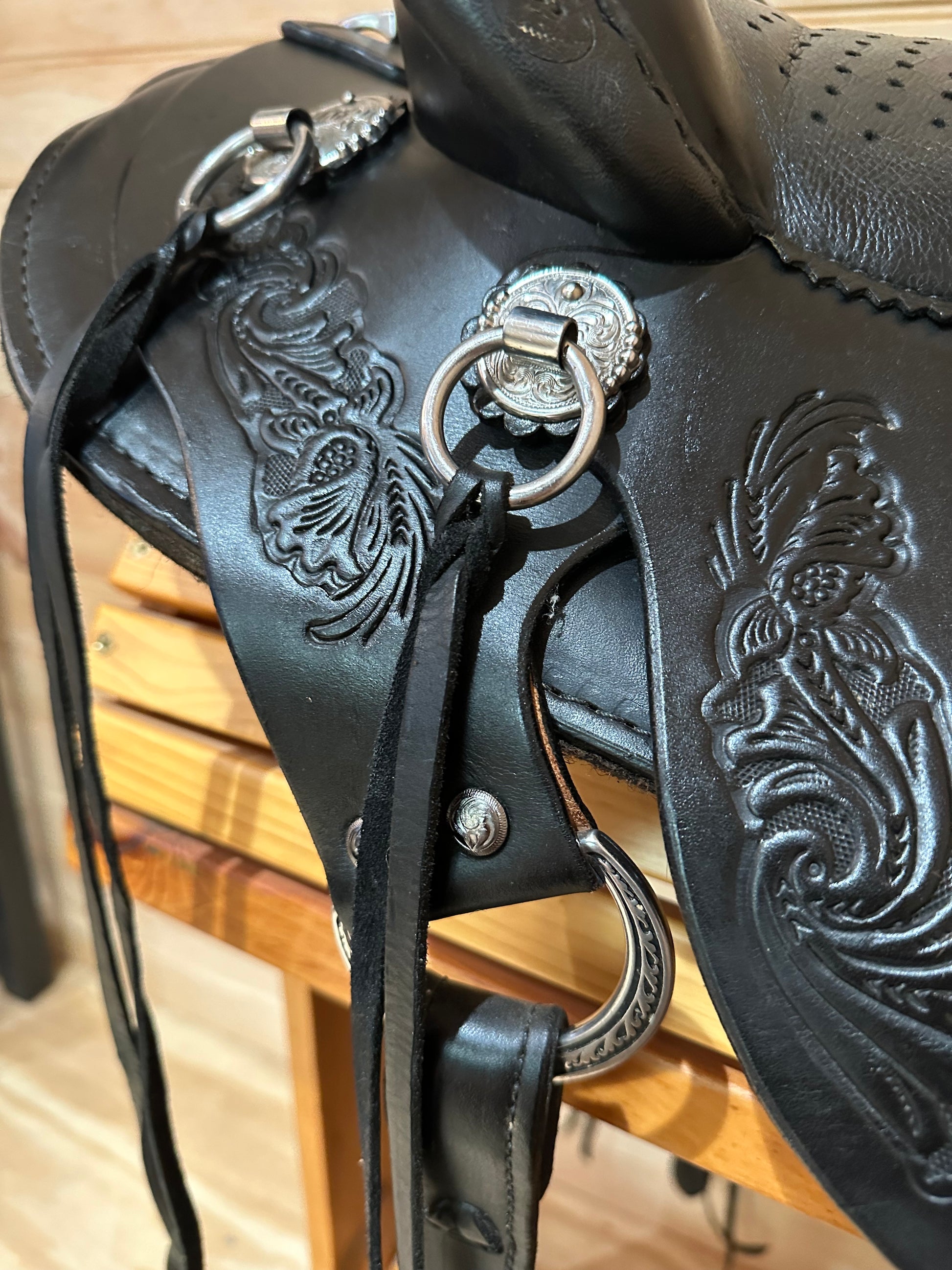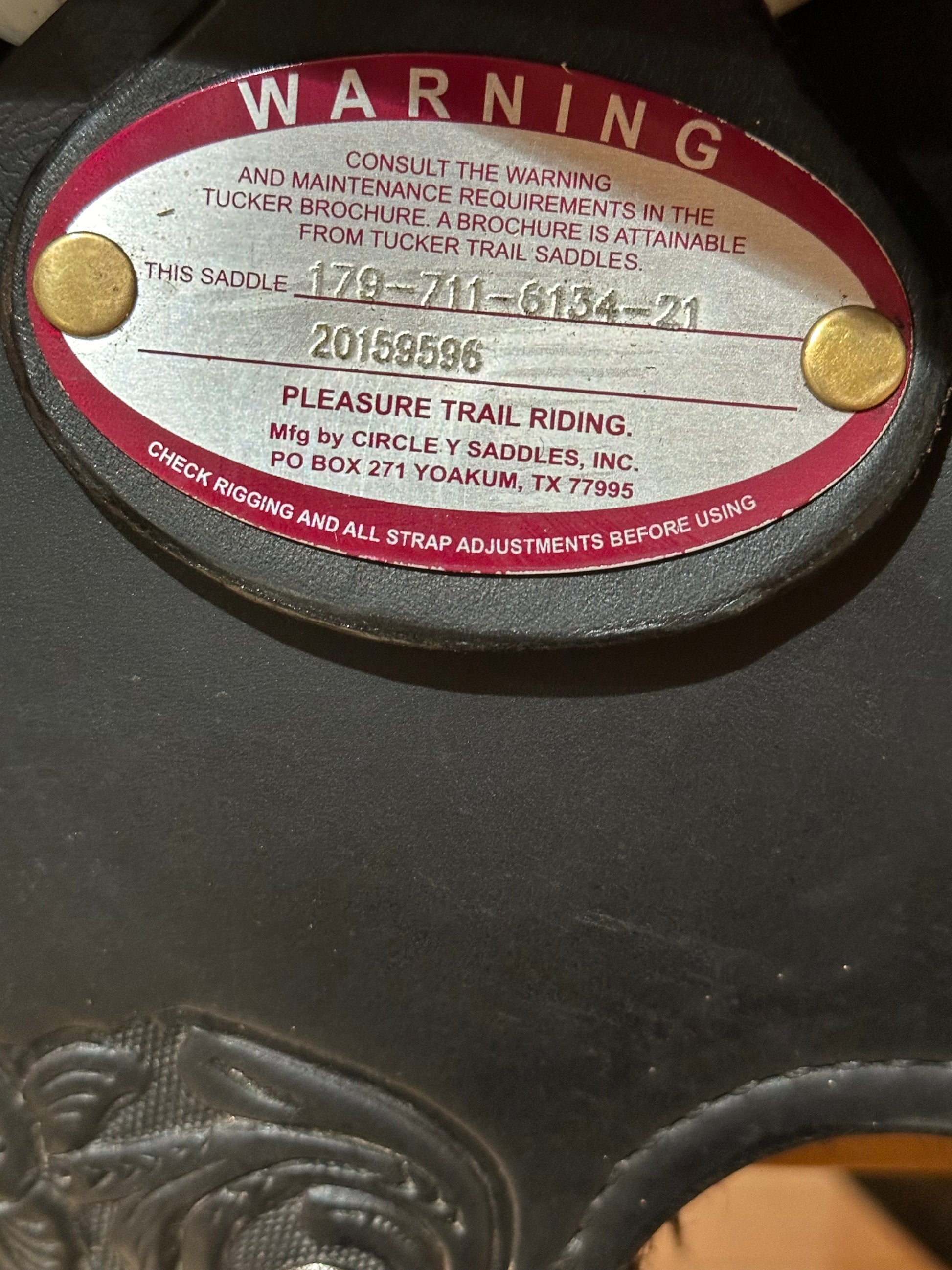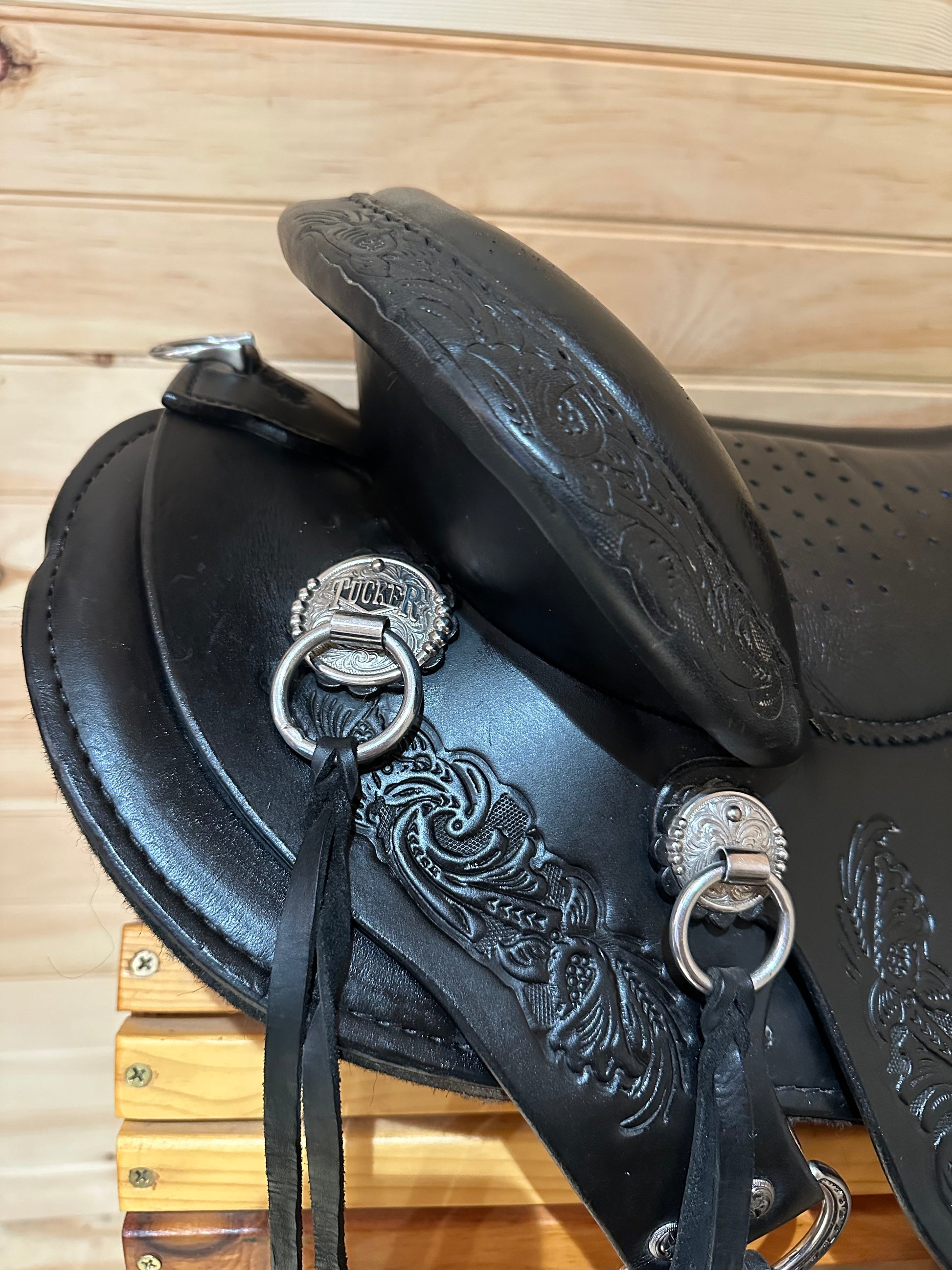 - Hardware: Chrome with engraved Tucker logo conchos and rings