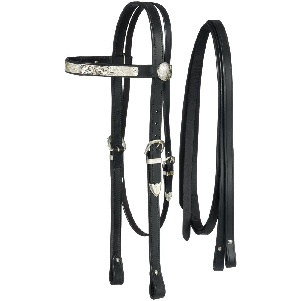 This handsome leather headstall is double-stitched for maximum durability. The 1” wide browband is accented with an intricately engraved silver plate and round conchos. Fully adjustable at cheeks and throatlatch to fit most drafts or large horses. Screw bit ends. Complete with matching split reins.