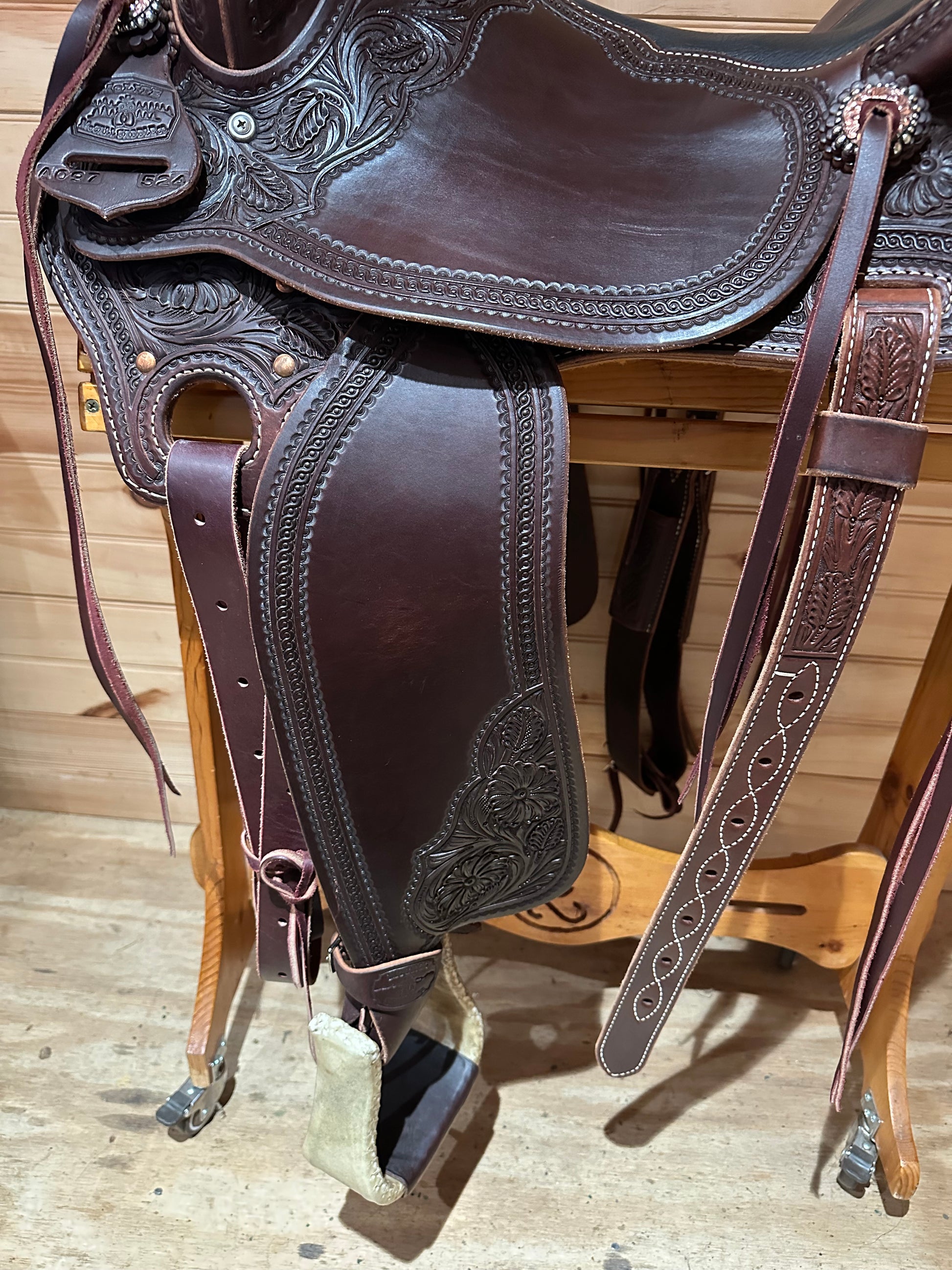 Flank Cinch: Tooled and stitched billets with 2½" wide cinch