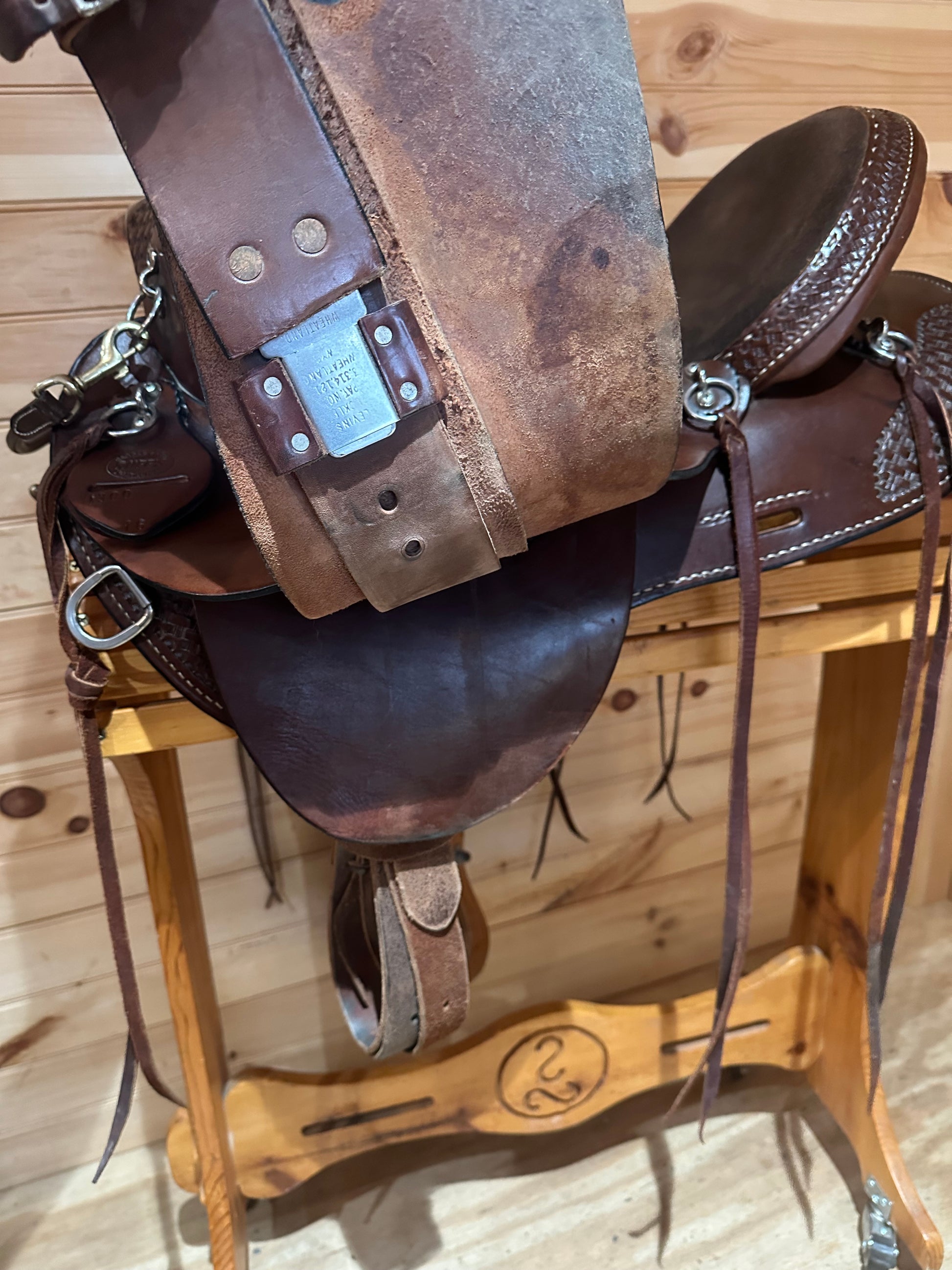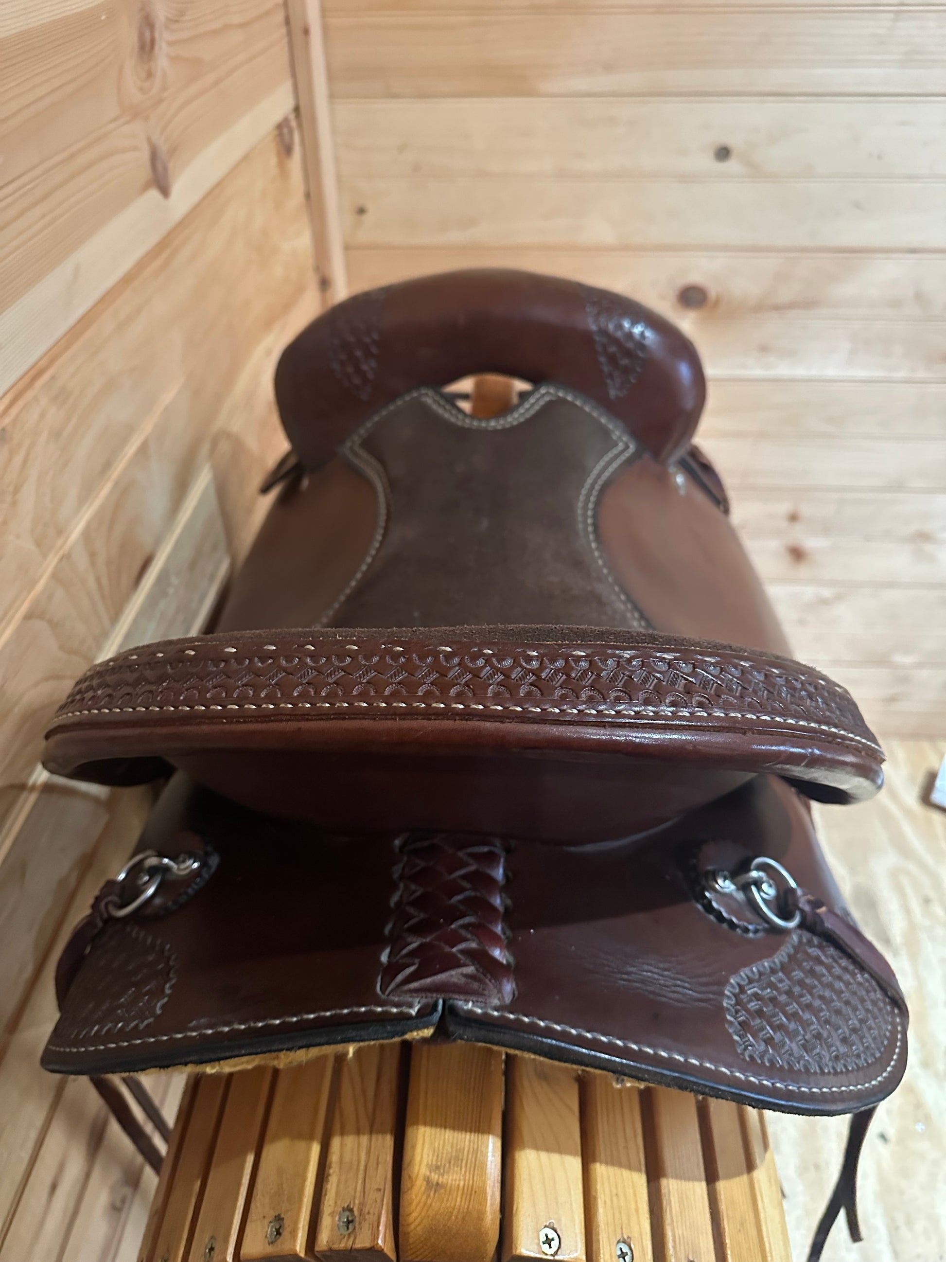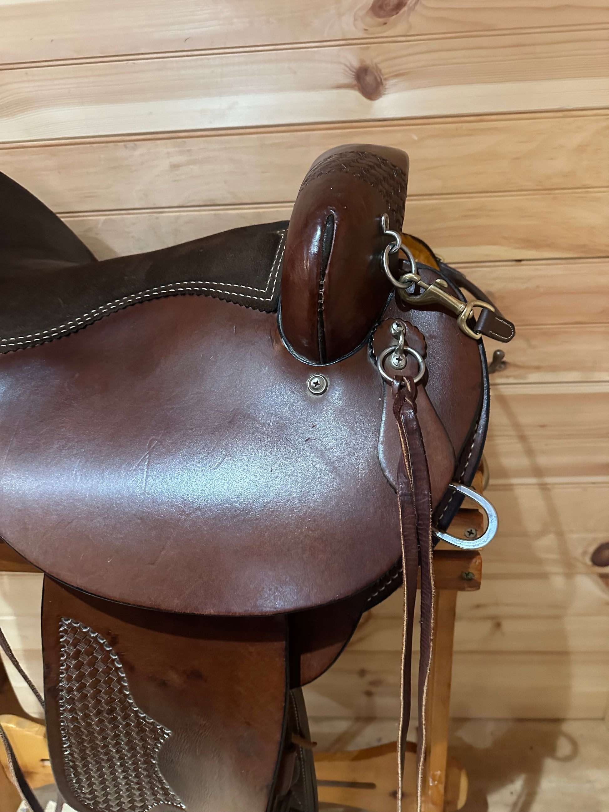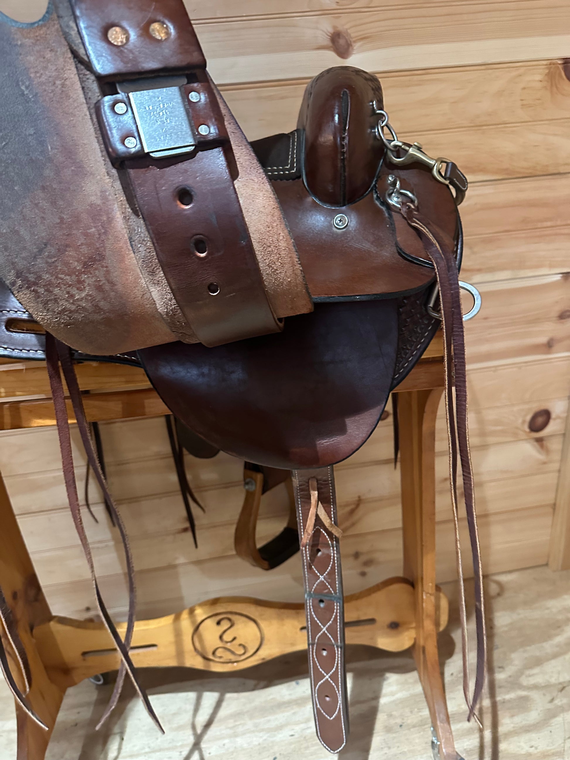Features: Medium brown oil leather, partial tooling accents, saddle strings, deep and padded suede seat, chrome hardware, wood stirrups, clip on pommel strap