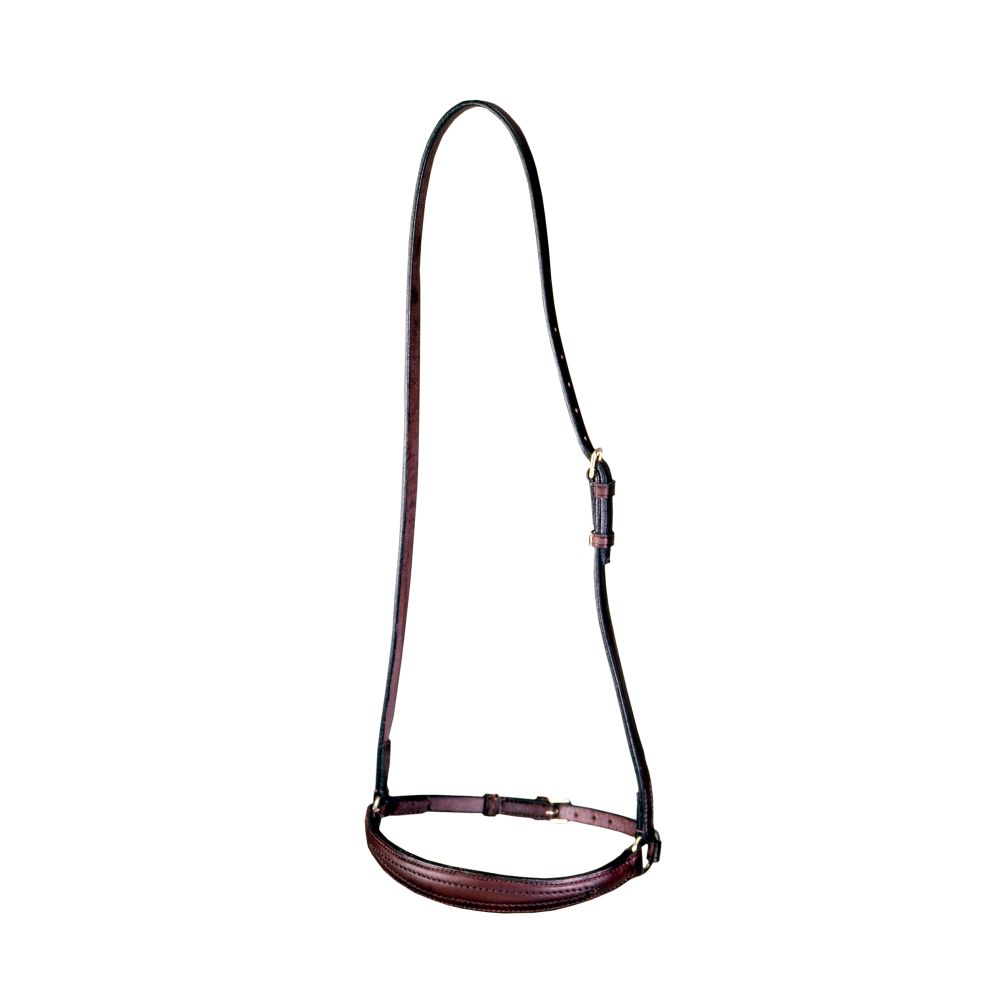 Classic quality leather replacement caveson with raised noseband to fit with your show bridle. Nose piece measures 1" wide at the center. Stainless steel hardware includes ring for noseband. Fits full sized hroses, brown leather.