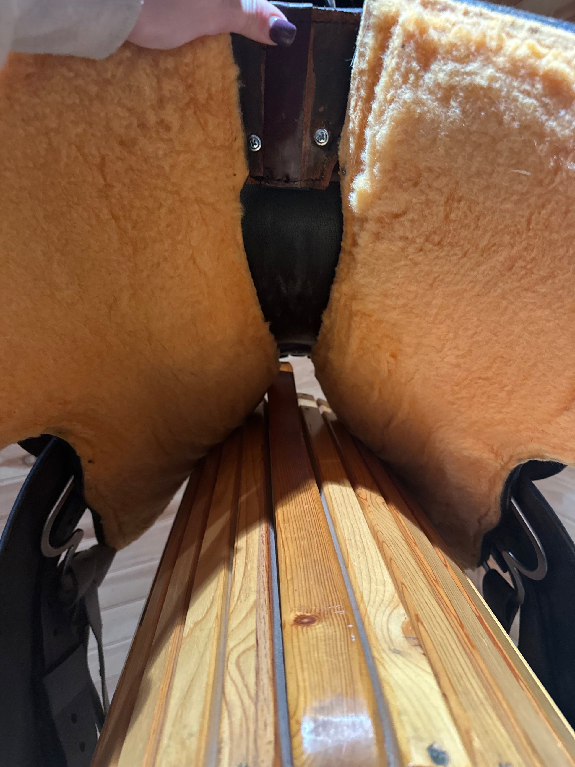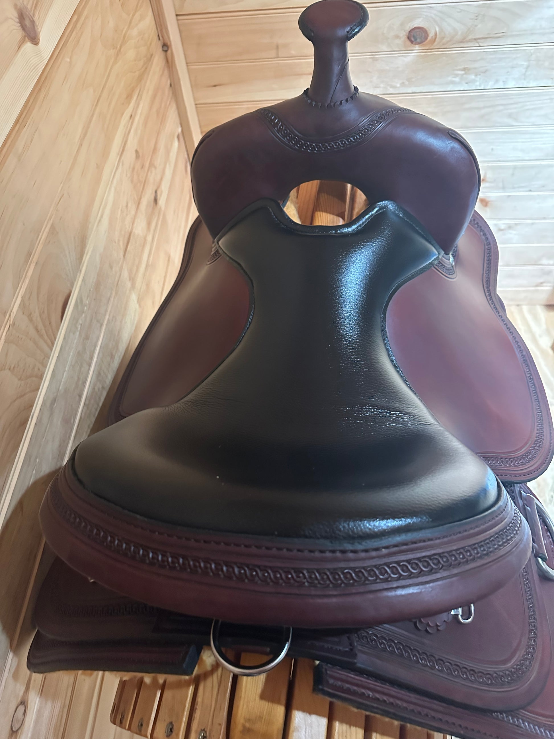 Stunning model with hard to find features! Perfect for shorter backed horses. Extra wide Tree- runs narrow fits more like a wide. Soft & Supple Leather, New Shorter Skirt Design. Great for Trails, Western Dressage & Ranch Riding. Double rigging, well padded seat, leather wrapped bell stirrups